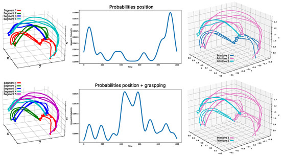 As observed, adding the gripper grasping information changes the segmentation. The initial segment (red) was divided into two movements where there was only one before, as the first part was performed with an open hand, and the second part with the hand holding the object. This led to changes in the movement primitive libraries, reducing the primitives from three types in the case of using only position to two primitives when using the combined information of position and grasping. In both cases, none of the solutions resulted in over-segmentation.