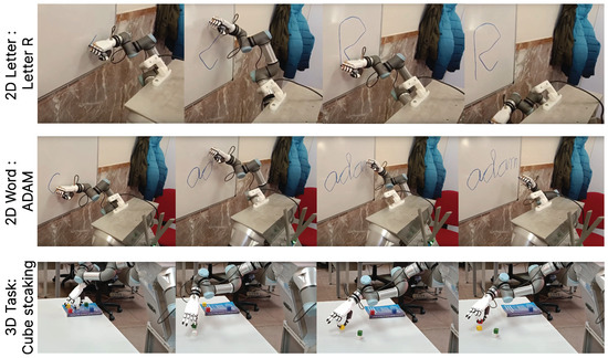 Tests were conducted in both 2D and 3D using the generated datasets. For the first 2D task, which involved writing uppercase letters, the objective was to write a series of letters by reversing the direction of the learned primitives (i.e., writing the letters backward). In the word dataset, after segmenting and learning the individual letters that composed the words, the letters were rearranged to form new words without explicitly learning their sequence. For the 3D task, a colored block stacking activity was performed. The dataset involved arranging blocks into towers of various shapes, following a consistent process for each color. After segmenting and generating the different primitives, a new task was conducted by arranging the blocks into new patterns with distinct color sequences. This approach evaluated the algorithm’s ability to generalize tasks using the learned primitives, eliminating the need to retrain the algorithm for each new task, as the movement primitives were already available. All these results for the different experiments using the ADAM robotic platform can be seen in Figure 13, where frames of the performed tasks are presented and explained in greater detail in the following video: https://youtu.be/A3m2sbUI5F0, accessed on 17 December 2024.