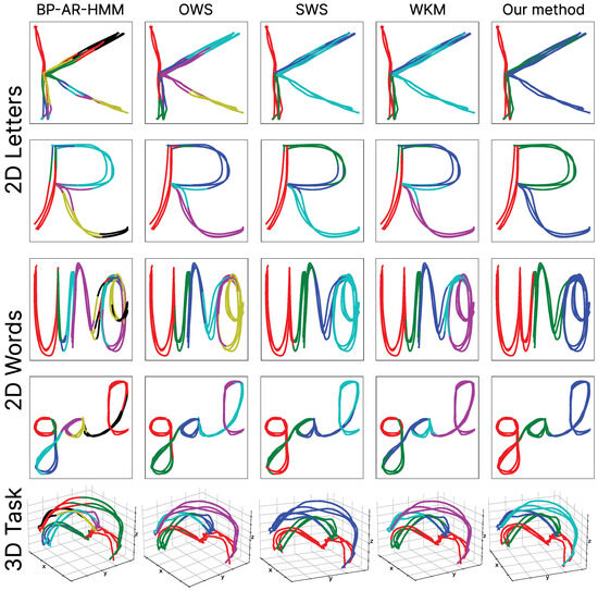 Example of segmentation results by the different compared algorithms for 2D letters (ground truth for both cases, 3 segments), 2D words (ground truth for both cases, 3 segments), and a 3D pick-and-place task (ground truth, 4 segments).