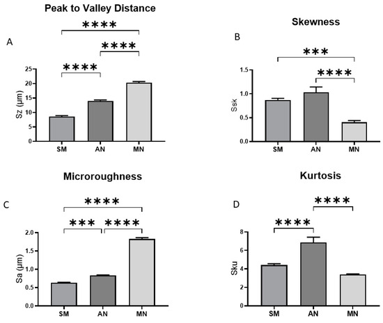 Optical profilometry measurements of surface micro-roughness of smooth machined (SM), anodized (AN), and micro/nano-rough (MN) Ti6Al4V surfaces: average peak-to-valley distance (A), skewness (B), microroughness (C), and kurtosis (D). Data are means ± SEM and were evaluated using analysis of variance (ANOVA) with Tukey post hoc test. Statistical significance was established at p-values equal to or less than 0.05 (*** p < 0.001; **** p < 0.0001).
