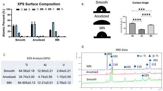 Implant surface characterization of smooth machined (SM), anodized (AN), and micro/nano-rough (MN) Ti6Al4V surfaces: (A) X-ray photoelectron spectroscopy (XPS) was used to determine elemental composition, shown as mean atomic percentage (%) of carbon (C), oxygen (O), titanium (Ti), aluminum (Al), and vanadium (V). (B) Surface wettability was quantified through sessile drop contact angle measurements performed on each surface. (C) Semi-quantitative energy-dispersive X-ray spectroscopy (EDX) analysis of surface elemental composition was obtained from ion-milled cross-sections of each surface, shown as mean atomic percentage (%) of titanium (Ti), aluminum (Al), and vanadium (V). (D) X-ray diffraction (XRD) profiles were used to determine distribution of α-Ti and β-Ti phases for each surface material, with circles depicting α-Ti, whereas triangles distinguish β-Ti phase based on elemental reference standards for EDX. Data are presented as mean + SEM and were evaluated using analysis of variance (ANOVA) with Tukey post hoc test. Statistical significance was established at p-values equal to or less than 0.05 (*** p < 0.001; **** p < 0.0001).