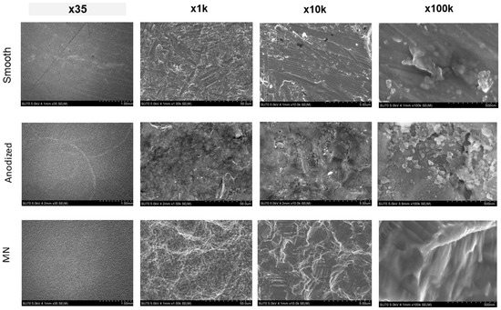 Characterization of surface topography using scanning electron microscopy (SEM). SEM micrographs/images of smooth, anodized, and micro/nano-rough (MN) Ti6Al4V surfaces were captured at macroscale (35×), microscale (1000×), mesoscale (10,000×), and nanoscale (100,000×) resolutions. Macro/micro/meso/nanoscale images have scale bars of 1 mm, 50 μm, 5 μm, and 500 nm, respectively.