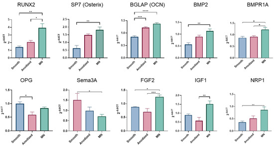 Our investigation reveals that certain molecular factors are consistently expressed under different culture conditions. These factors include BMP4, BMPR2, TGFβ1, TGFβ2, TGFβR1, sema3C, VEGFA, ANG1, and NRP2, among others. It is important to note that this analysis represents a snapshot in time, making it difficult to interpret these findings in the overall context of the cell response to the surface. Our results demonstrate, however, that cellular responses are highly sensitive to the micro/nano surface topography and chemistry. Moreover, we focused our analysis on genes encoding proteins integral to bone tissue regeneration, including cell recruitment, attachment, and proliferation. Specifically, we observed the modulation of several key genes, including ANPEP, encoding alanyl aminopeptidase, a membrane-bound enzyme involved in peptide catabolism; FN1, encoding fibronectin, an extracellular matrix glycoprotein crucial for cell adhesion; JAG1, encoding a protein pivotal for new blood vessel development; SERPINF1, known for its dual role as an anti-angiogenic factor and neurotrophic agent; and PVR, a protein implicated in cell proliferation and migration. Of particular interest is the coordinated upregulation of ANPEP, JAG1, and SERPINF1 observed on the MN surface. This specific gene expression profile suggests that cells on the MN surface are actively modifying their extracellular milieu to promote vascularization and neurogenesis; such processes are intrinsically linked to successful bone regeneration. These findings collectively indicate that MN surface modifications elicit a sophisticated cellular response, characterized by the orchestrated regulation of genes involved in tissue remodeling, angiogenesis, and neurogenesis.