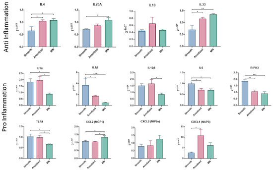 The expression levels of IL4, IL23A, and IL33 were significantly elevated on MN compared to smooth Ti6Al4V, although no difference was observed between MN levels compared to the anodized surface. IL10 expression was unaffected by surface topography. In contrast to their stimulatory effect on anti-inflammatory mediators, MSCs grown on MN surfaces decreased their expression of pro-inflammatory factors, including IL1α, IL1β, IL12β, IL6, RIPK3, and TLR4. The anodized surface similarly reduced expression of IL1β, IL6, and RIPK3 by MSCs. Anodized surfaces similarly reduced the expression of IL1β, IL6, and RIPK3 by MSCs. However, not all pro-inflammatory mediators were downregulated; CCL2 (MCP1) showed increased expression, while CXCL2 remained unaffected. CXCL1 (NAP3) was markedly increased on the anodized surface compared to the smooth surface.