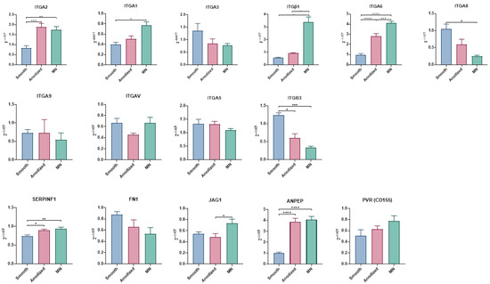 Integrin expression patterns were sensitive to surface topography (Figure 6). The expression of ITG1, ITGA2, ITG6, and ITGβ1 was upregulated in MSCs grown on MN, with ITGA2 and ITG6 also being increased on anodized surfaces. Conversely, the expression of ITG8 and ITGB3 was reduced on anodized surfaces. The expression of ITGα3, ITG5, ITGA9, and ITGV was unaffected by surface modifications. Other regulatory factors exhibited surface-specific expression patterns. ANPEP and SERPINF1 were comparably elevated on both anodized and MN surfaces, while JAG1 expression increased only on the MN surface. The expression of FN1 and PVR (CD155) remained unaltered across all surface types.