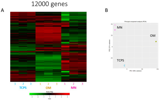 Comparison of 12,000 differentially expressed genes (DEGs) of human BMSCs grown in osteogenic media (OM), compared with BMSCs cultured on micro/nano-rough (MN) surfaces or TCPS in standard growth media: (A) Heatmap of sample z-scores clustered using Euclidean distance measurement. Red and green in heat map denote upregulated and downregulated genes, respectively, while gray denotes no significant difference between groups. (B) Principal component analysis (PCA) plot generated from 12,000 differentially expressed genes in hBMSCs grown for 14 days on TCPS in OM, TCPS in growth media, or MN surfaces in growth media, as determined by RNA-seq. Results from two independent experiments are shown.