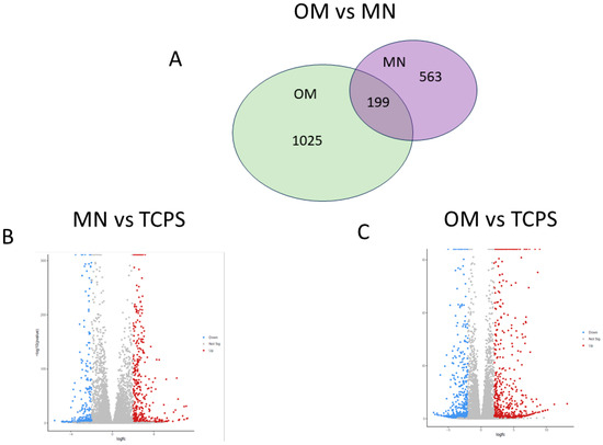 Comparison of 12,000 differentially expressed of genes (DEGs) of human BMSCs grown on TCPS in osteogenic media (OM), or BMSCs cultured on micro/nano-rough (MN) surfaces in growth media, compared to cells on TCPS in growth media. (A) Venn diagram displaying overlap of differentially expressed genes, showing overlap between OM and MN cultures. (B) Volcano plot of MN vs. TCPS genes with Log2 fold change greater than 2 and adjusted p-value less than 0.05. (C) Volcano plot of OM vs. TCPS genes with Log2 fold change greater than 2 and adjusted p-value less than 0.05. Red and blue denote upregulated and downregulated genes, respectively, while gray denotes no significant difference between groups.