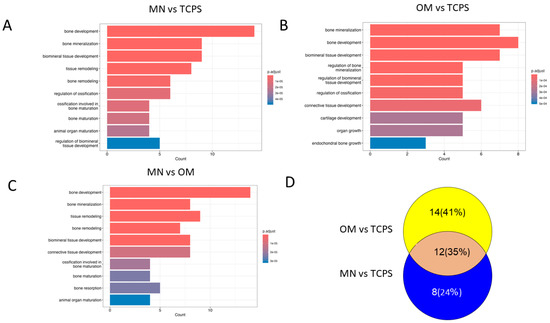 Functional enrichment analysis of genes expressed by BMSCs grown on TCPS in growth media (TCPS), TCPS in osteogenic media (OM), and micro/nano-rough Ti6Al4V in growth media (MN). The enriched pathways were visualized using a barplot for each pairwise comparison of treatments: (A) MN vs. TCPS, (B) OM vs. TCPS, and (C) MN vs. OM. (D) The Venn diagrams were created by determining the overlapping pathways between OM vs. TCPS and MN vs. TCPS.