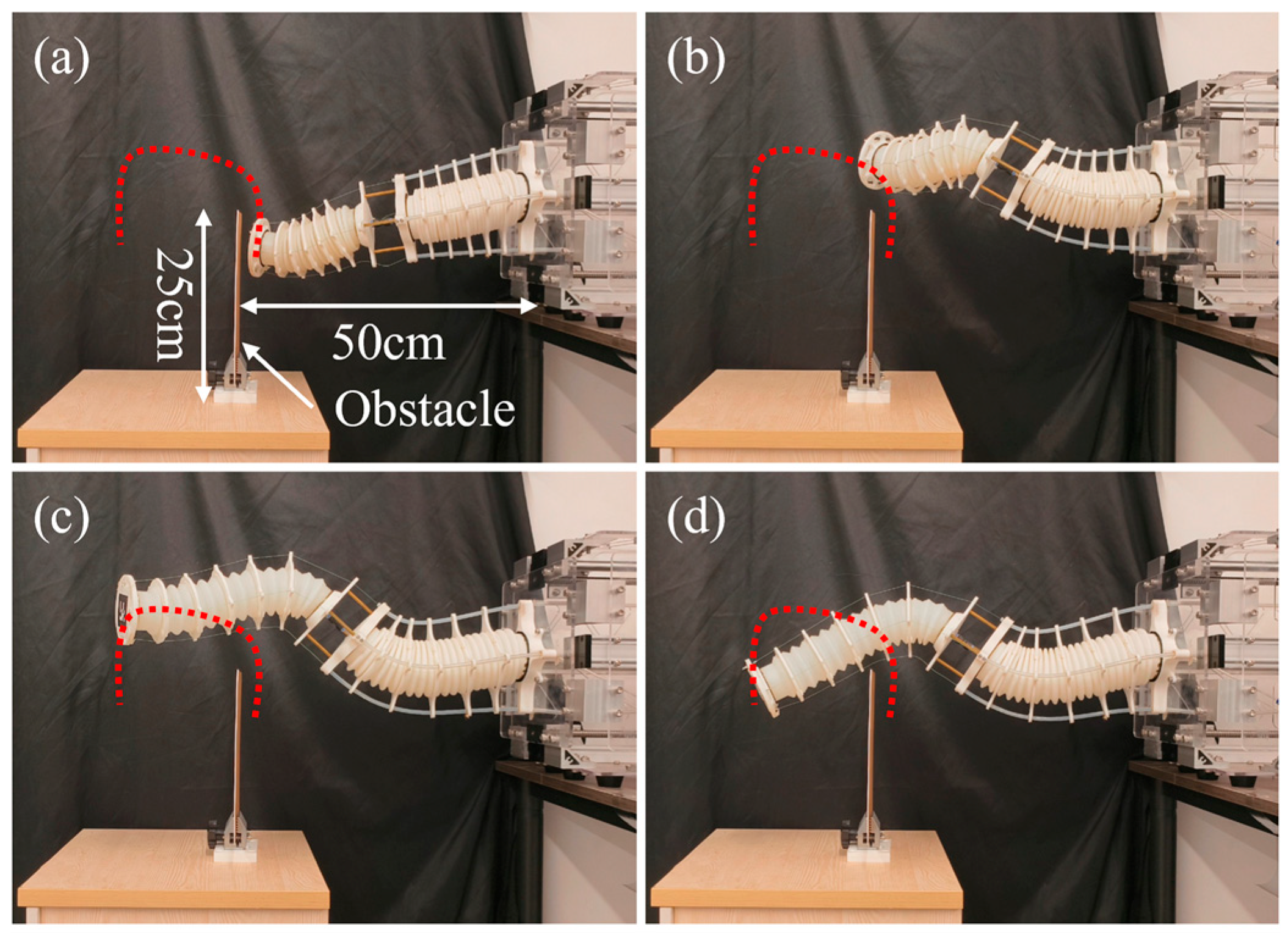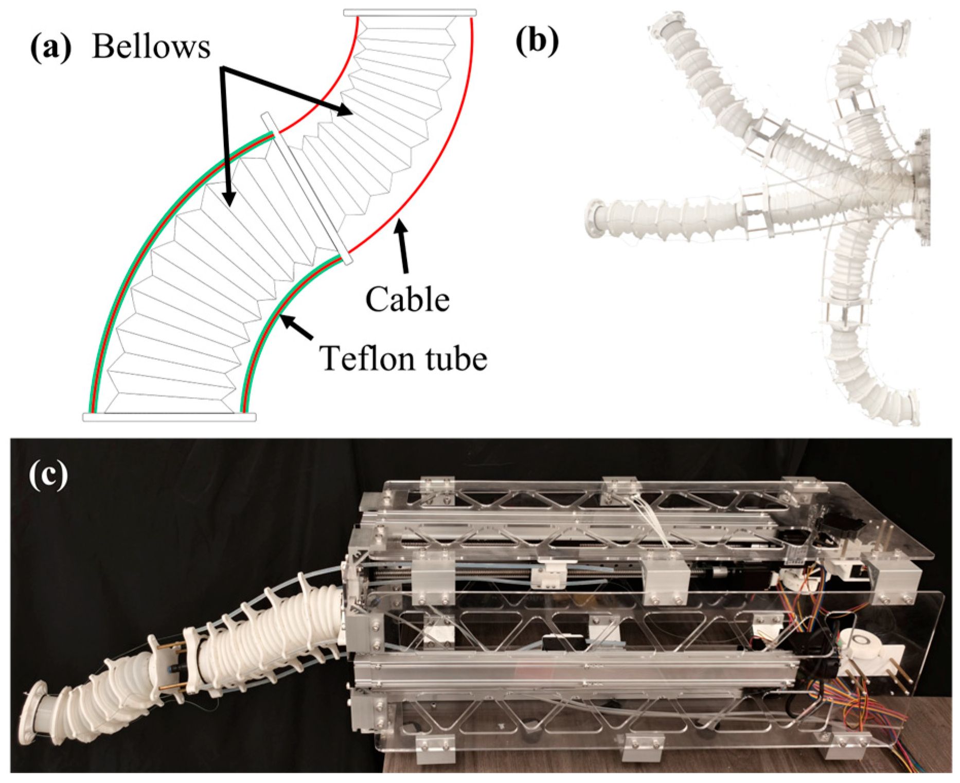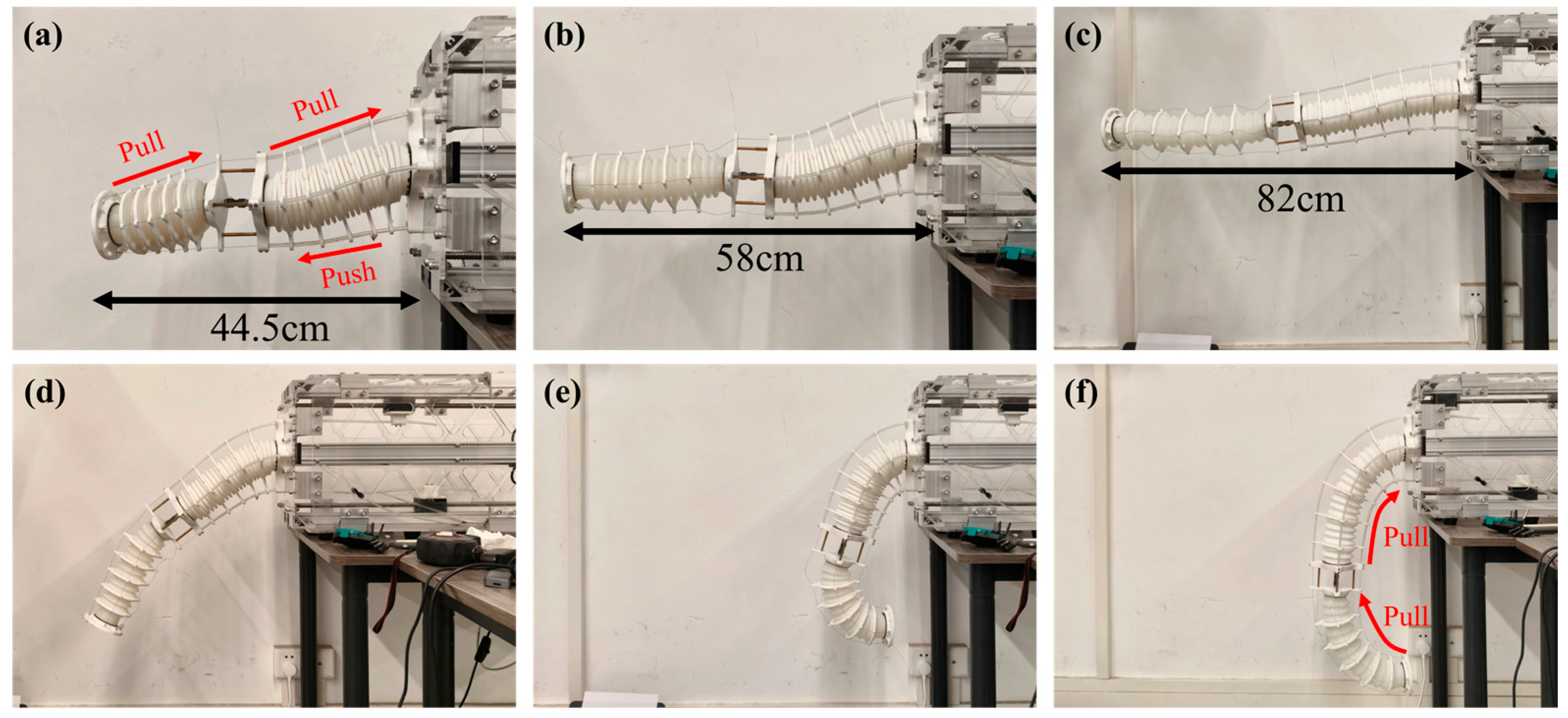 - Sui, D.; Zhao, S.; Wang, T.; Liu, Y.; Zhu, Y.; Zhao, J. Design of a Bio-Inspired Extensible Continuum Manipulator with Variable Stiffness. J. Bionic Eng. 2025, 22, 181–194. [Google Scholar] [CrossRef]