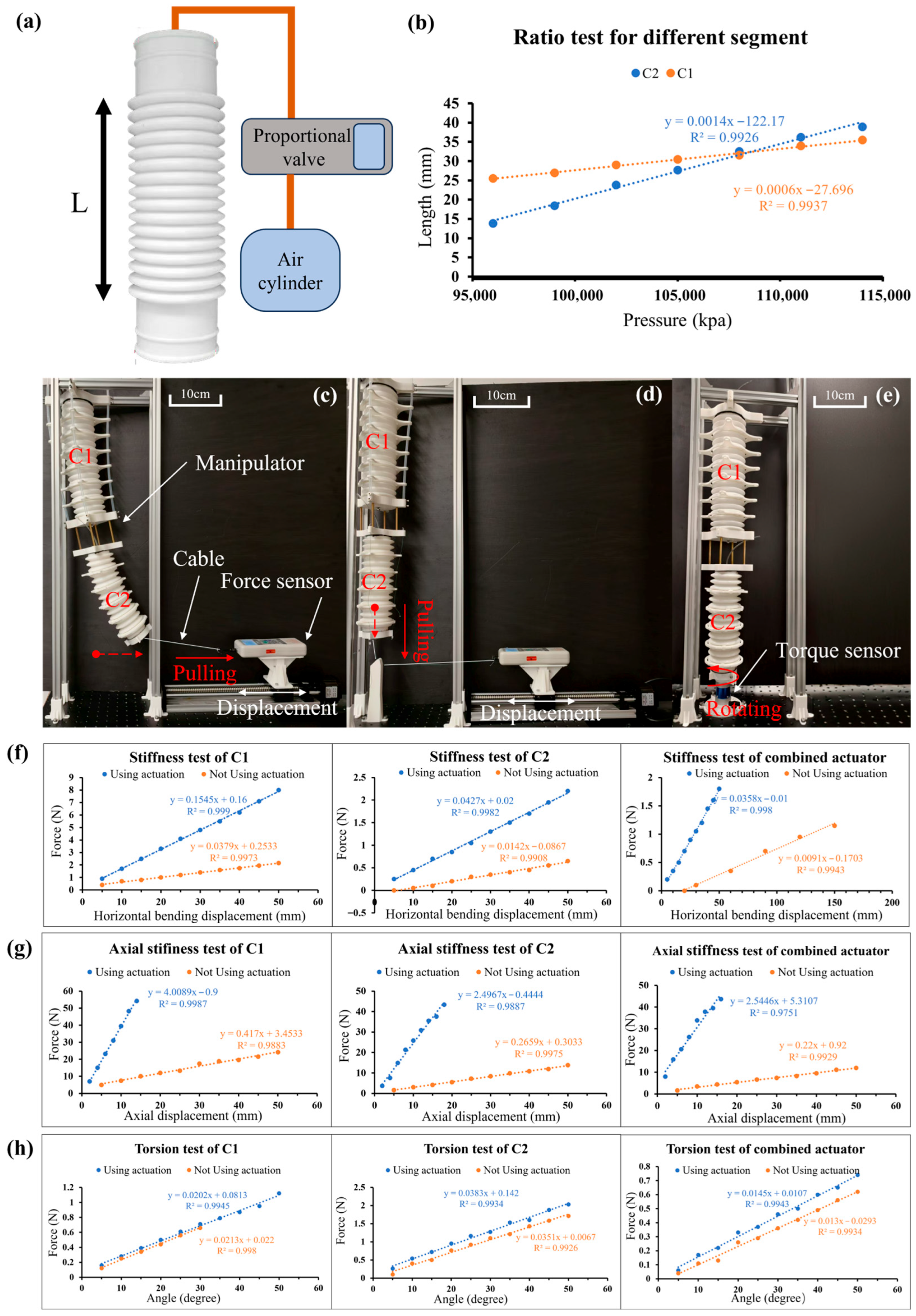 - A novel two-segment soft manipulator is proposed, driven by a pneumatic–tendon hybrid drive mechanism that enables extension, bending, and stiffness modulation. The design integrates off-the-shelf industrial components with 3D printing, reducing manufacturing complexity and cost. The segmented structure with differentiated stiffness effectively prevents motion coupling, ensuring stable control.