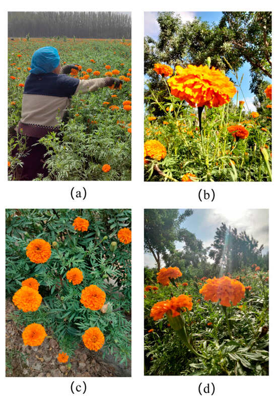 Marigold (Tagetes erecta L.) is an annual herb of the compositae family. Its flowers are rich in volatile oils, flavonoids, polysaccharides, triterpenoids and various other essential trace elements for the human body, and have significant value in horticultural appreciation, healthcare and food processing [1]. However, the current manual harvesting method (low efficiency, high cost and significant damage) has become a key bottleneck restricting its industrial development. The harvesting window period of this crop is concentrated from July to October, and harvesting operations need to be carried out approximately every 10 days. The existing harvesting mode has high labor intensity and low efficiency, resulting in high costs and inability to meet the needs of large-scale planting. Therefore, the development of efficient, precise and low-damage harvesting technology is crucial for promoting the sustainable development of the marigold industry. Existing mechanical harvesters typically employ non-selective strategies, which generally have problems such as low cleaning rate and severe mechanical damage to the plants [2]. With the rapid development of artificial intelligence and robot technology, agricultural robots provide a new technical path for the realization of automatic and precise harvesting of marigolds. The core challenge lies in the high-precision recognition of target flowers and, based on this recognition, efficient continuous path planning. Therefore, achieving accurate marigold target recognition is the primary and crucial step.