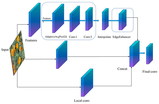 Figure 3 illustrates the architecture of the proposed Multi-scale Edge Information Enhancement (MSEE) module, which synergistically integrates multi-scale perception with edge refinement for efficient edge feature modeling. The module comprises three key components: (1) a multi-scale feature perception branch employing adaptive average pooling to generate multi-resolution feature maps, followed by 1 × 1 convolution for channel reduction and 3 × 3 depthwise separable convolution for efficient cross-scale feature extraction; (2) an edge enhancement sub-module that computes spatial gradients (e.g., via Sobel operators) on pooled features to highlight edge transitions, refines them convolutionally, and integrates the enhanced edges with the original input via residual summation, significantly improving the edge signal-to-noise ratio while suppressing noise; and (3) a local-to-global fusion mechanism where a dedicated 3 × 3 convolution branch preserves high-resolution texture details, multi-scale features are upsampled and concatenated channel-wise with these local features, and a final convolutional layer integrates them into a unified representation, achieving complementary fusion of fine-grained details and contextual information.