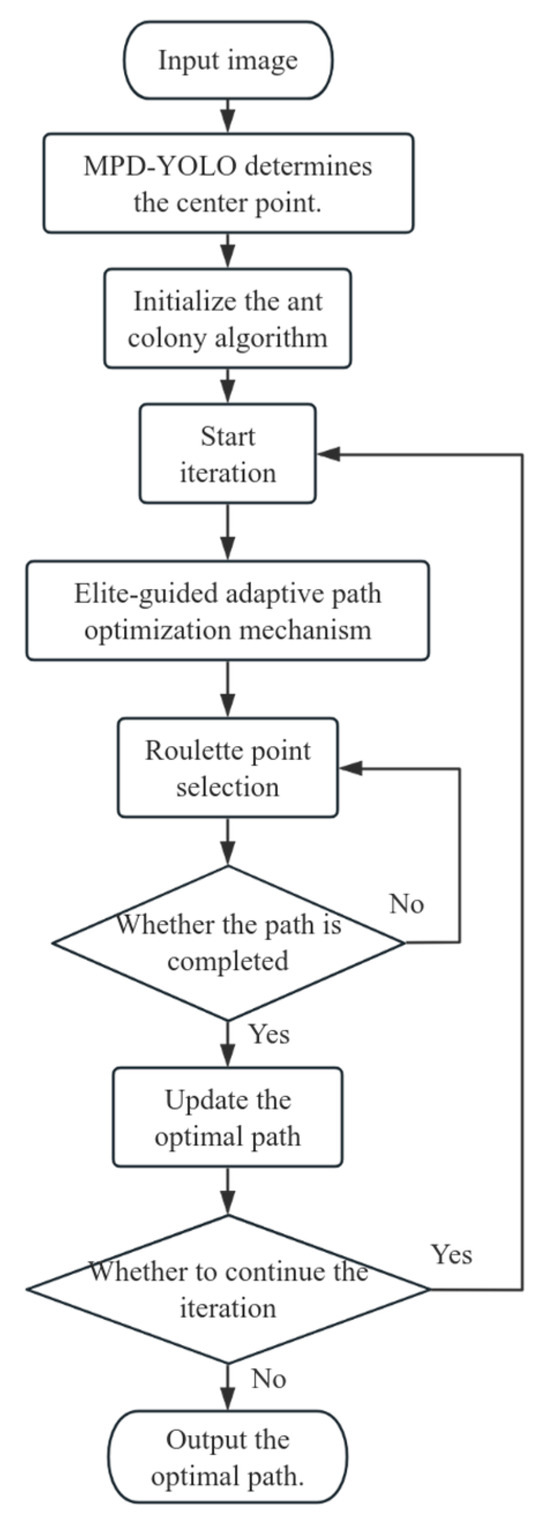 The traditional ant colony optimization (ACO) algorithm exhibits limitations in convergence speed and susceptibility to premature convergence, often becoming trapped in local optima. These drawbacks are particularly acute for large-scale problems, where the substantial number of iterations required to reach the optimal solution struggles to meet the efficiency demands of complex scenarios. To mitigate these issues, this study introduces a parameter adaptive mechanism, dynamically adjusting key parameters () based on iteration progress, and an elite pheromone update strategy, which selectively reinforces only the pheromone trails of the current global-best path to suppress ineffective diffusion [26]. These enhancements collectively accelerate convergence, yield shorter planned path lengths, reduce the need for frequent visualization and multiple trial averaging, and effectively curtail computational costs while ensuring solution stability. The specific implementation process is detailed in Figure 6.
