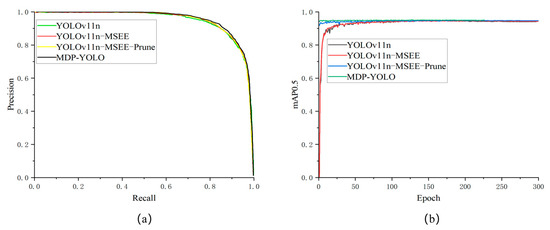 Comparison among various curves during the training process; (a) mAP0.5 curve; (b) PR curve.