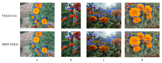 As shown in Figure 9, to verify the detection performance of the model in complex marigold scenes, this study conducted comparative experiments under different lighting conditions such as front lighting, back lighting, and side lighting, as well as in large scenes with extensive flower adhesion. The results indicate that both YOLOv11n and its improved model MPD-YOLO can effectively identify marigolds in various environments. However, under back lighting and complex backgrounds, the YOLOv11n model can only recognize flowers with a low degree of occlusion, and in strong light and severely occluded backgrounds, its detection of flowers in dense areas fails. Additionally, YOLOv11n also experiences recognition omissions when dealing with densely adhered and severely occluded flowers (as indicated by the red arrows in Figure 9). In contrast, the improved model proposed in this paper (MPD-YOLO) significantly enhances detection robustness and can effectively identify severely occluded areas and highly densely adhered marigold corollas. This result demonstrates that the improved model has high accuracy in recognizing marigolds under different lighting changes and fully showcases its excellent robustness.
