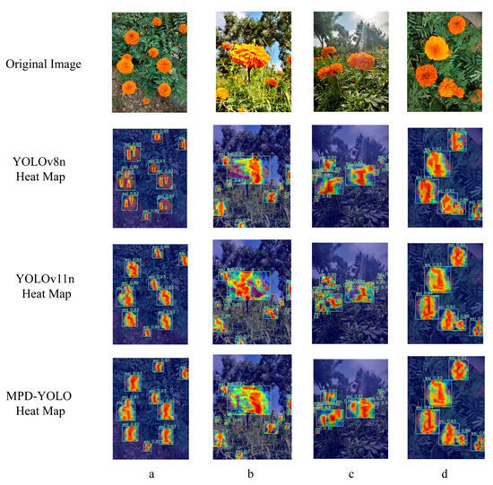 To evaluate the detection performance of the baseline and improved models for marigolds, this study employed Gradient-weighted Class Activation Mapping (Grad-CAM) to generate heat maps. As shown in Figure 10, the heat maps highlight key features through bright regions under three typical lighting conditions (front, back, and side lighting) and in cases where flowers are occluded. The identified marigold corollas are prominently highlighted, creating a sharp contrast with the blue background, which intuitively demonstrates the model’s ability to recognize and locate targets. These visualization results confirm the model’s effectiveness in marigold feature extraction, providing a robust foundation for subsequent continuous picking path planning.