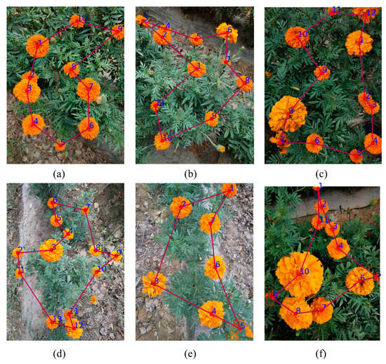 Although all three existing algorithms can solve the optimal picking path, their planning time still needs to be optimized. This study enhances the ACO algorithm to significantly reduce path planning time, expediting convergence to optimal solutions and improving picking efficiency. Key innovations include an adaptive parameter tuning mechanism that dynamically adjusts parameters during execution to accelerate computation, and an optimized pheromone update strategy reinforcing pheromone accumulation on superior paths to promote convergence while reducing computational complexity. The improved model has achieved a significant reduction in running time, enhanced robustness, and the dynamic parameter adjustment has reduced the risk of the algorithm getting stuck in local optima (for specific data comparisons, see Table 4). The final planned path is shown in Figure 11 (the planning process path is marked in blue, and the optimal path is displayed in a combination of red and blue to optimize the visual effect). Figure 11a–c indicate that the improved algorithm can effectively identify and plan the picking path of adhered marigolds; Figure 11d shows that the model can avoid picking marigolds that have not fully bloomed; Figure 11e,f verify that the model maintains strong robustness in the presence of occlusions. Most importantly, the average running time of the model has been reduced to just 2.2 s, significantly improving picking efficiency.