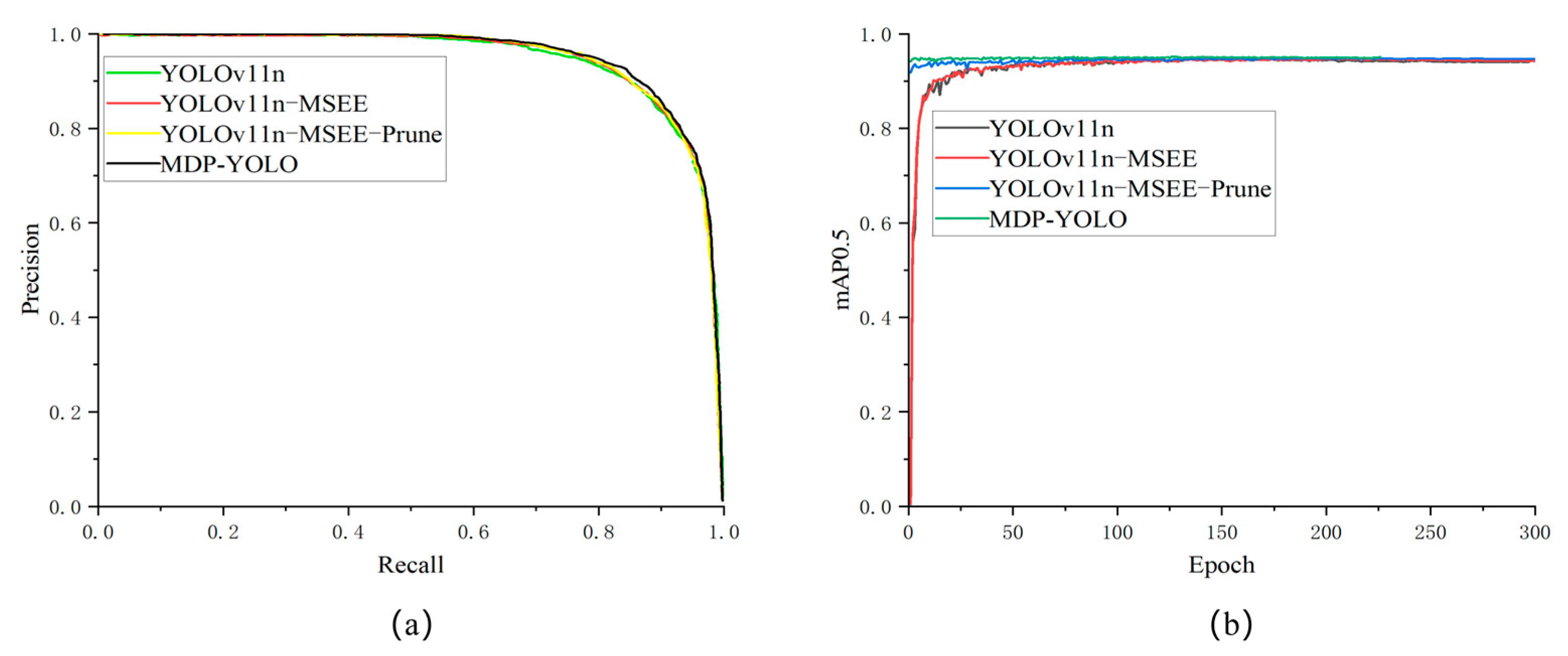 - The proposed MDP-YOLO model demonstrates significant advantages in achieving both a lightweight architecture and enhanced recognition performance. Compared with the YOLOv11n baseline, MDP-YOLO achieves a substantial reduction in model size (59.6%) and parameter count (67.7%), with computational complexity of only 3.1 GFLOPs. In terms of recognition performance, the accuracy rate has increased by 1.2%, the mAP has improved by 0.6%, and the recall rate has only slightly decreased by 0.1%. Furthermore, MDP-YOLO achieves a smaller model size than other prominent lightweight YOLO variants, including YOLOv5n (5.3 MB), YOLOv6n (8.7 MB), YOLOv8n (6.3 MB), YOLOv9s (15.2 MB), and YOLOv10n (5.2 MB). This compact size makes it particularly well-suited for deployment on resource-constrained edge devices.