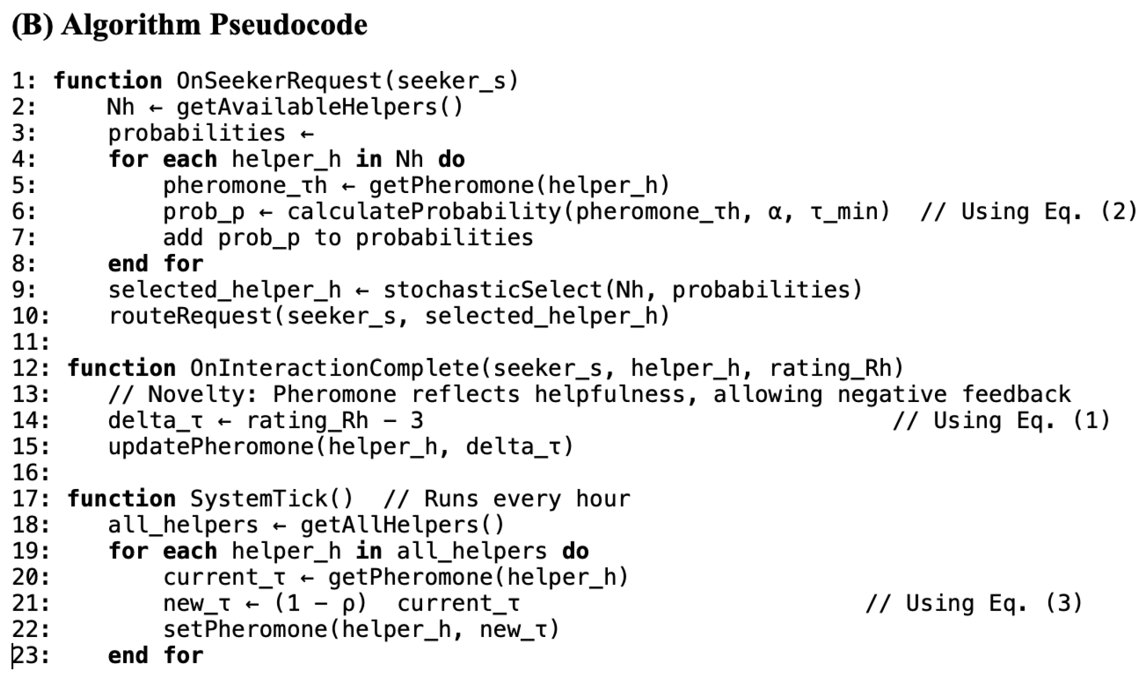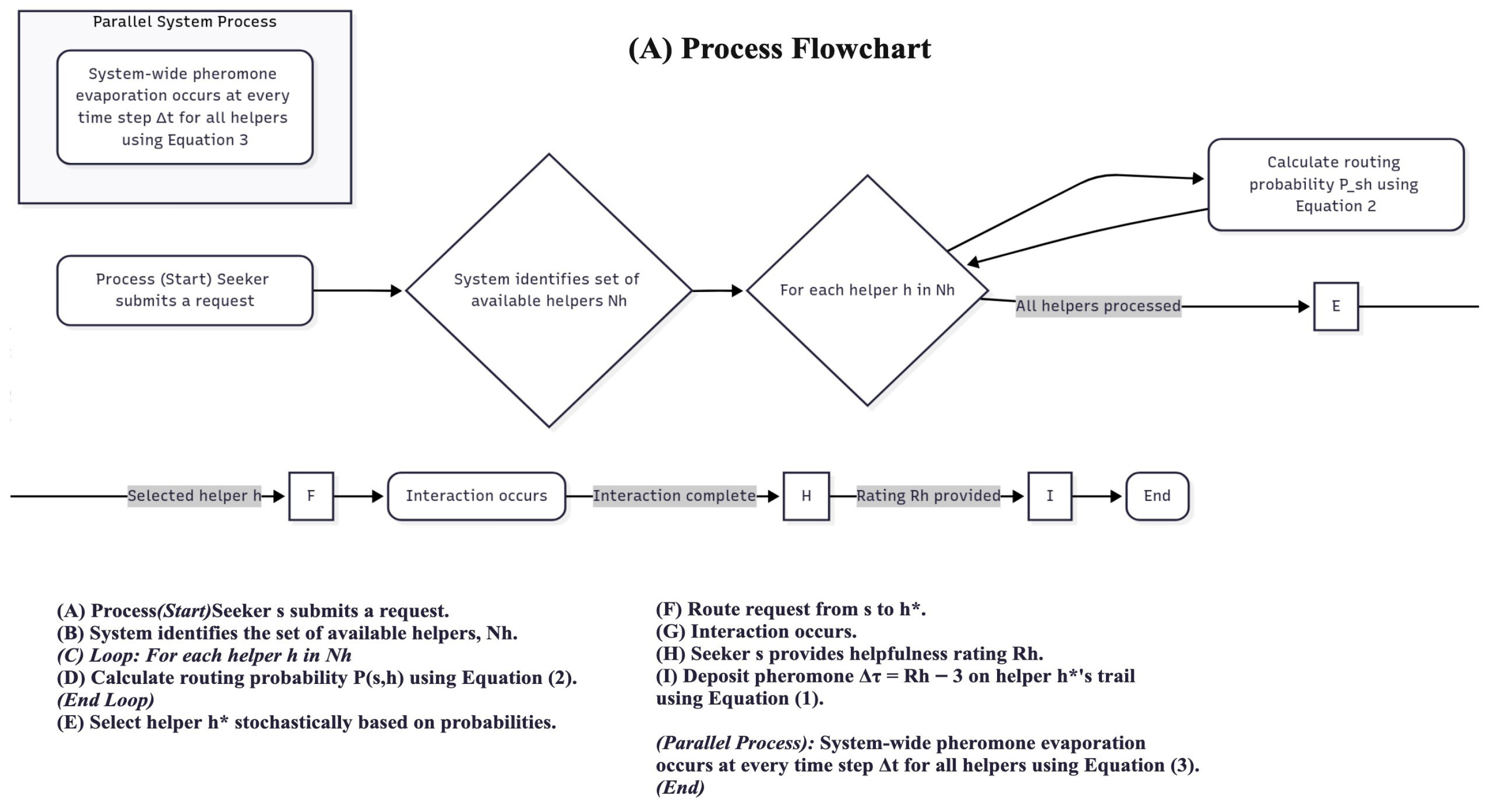 - Random Routing (Control): Help-seekers are matched to any available helper with a uniform probability, simulating the baseline condition in many existing peer support platforms.