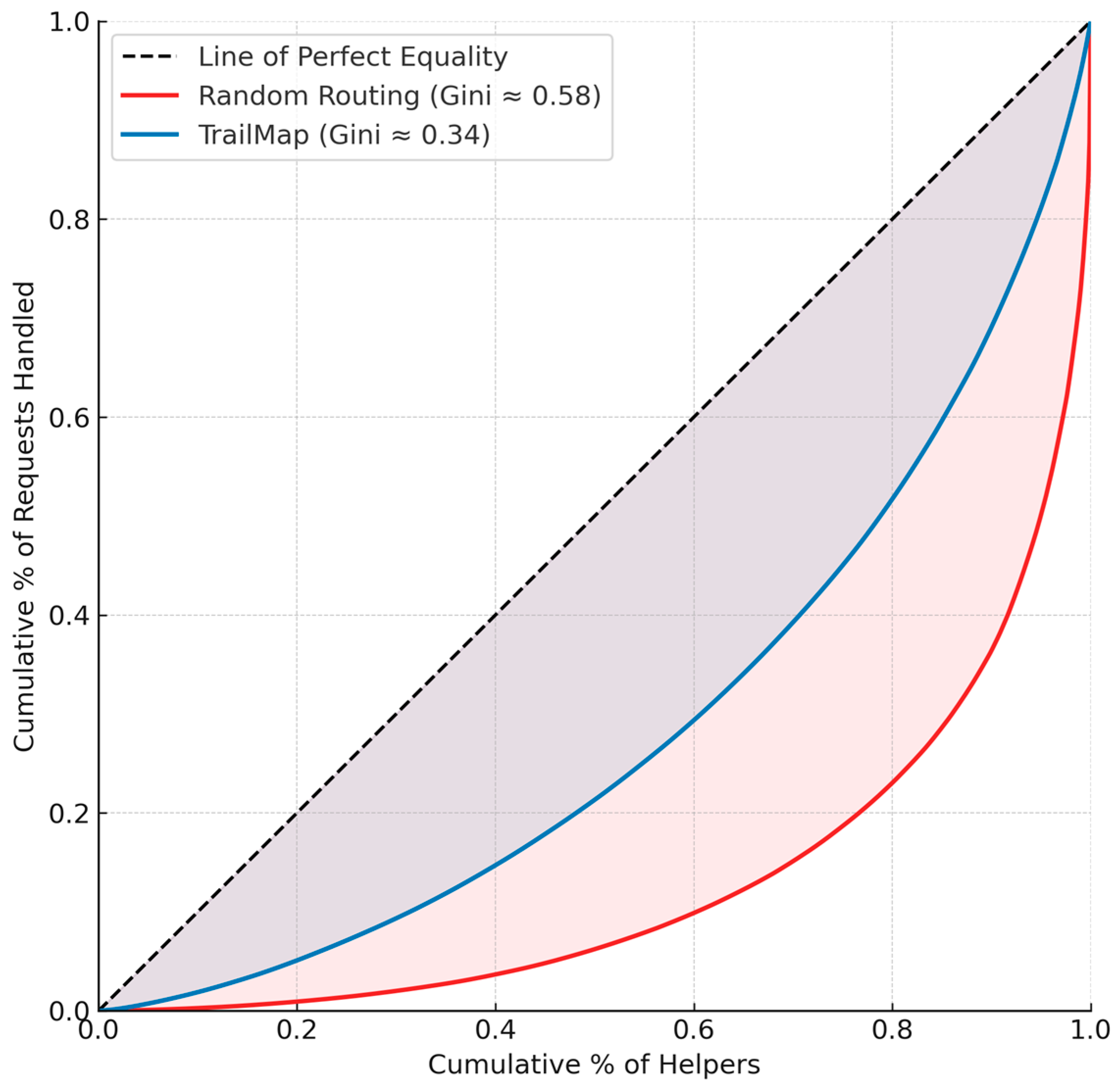 - Load Distribution (Gini Coefficient): The primary equity metric. The Gini coefficient, a standard measure of statistical dispersion typically used for income inequality, was applied to the distribution of requests handled per helper agent over a 30-day simulation [41,42]. Its application to measure heterogeneity and load imbalance in complex networks is well established [29,43,44,45]. A Gini coefficient of 0 indicates perfect equality (all helpers handle an identical number of requests), whereas a coefficient of 1 indicates perfect inequality (one helper handles all requests). This metric provides a robust, single-value measure of workload concentration and the “super-helper” effect.