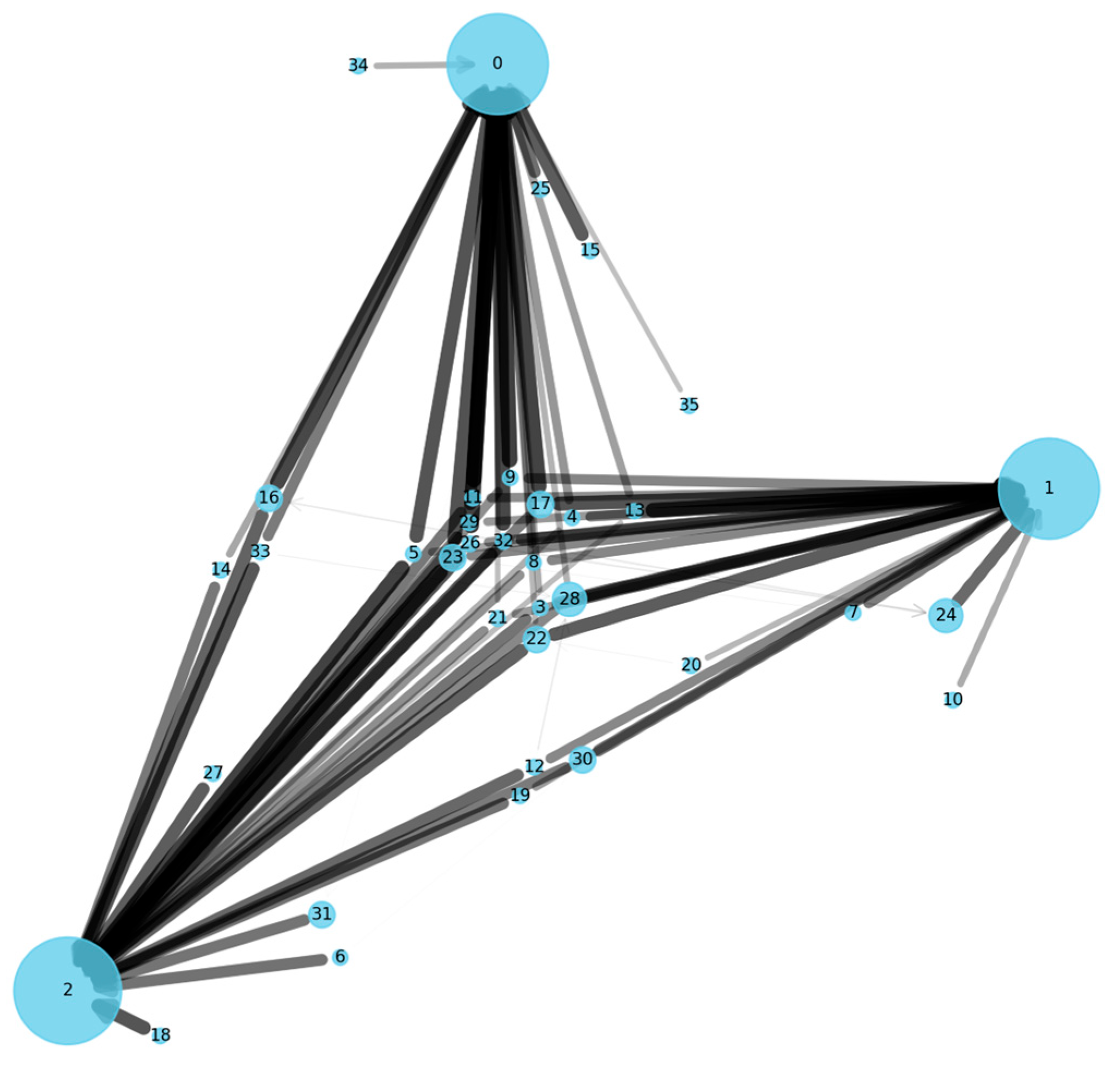 - Emergent Mentorship: A network analysis of the interaction graph from the TrailMap group (visualised in Figure 6) revealed the spontaneous emergence of several distinct helper clusters. These were small groups of highly rated users who accumulated strong pheromone trails and became de facto community mentors, frequently receiving requests from a wide range of seekers without any formal designation or top-down curation. This emergent social structure was absent from the random graph of the control group.