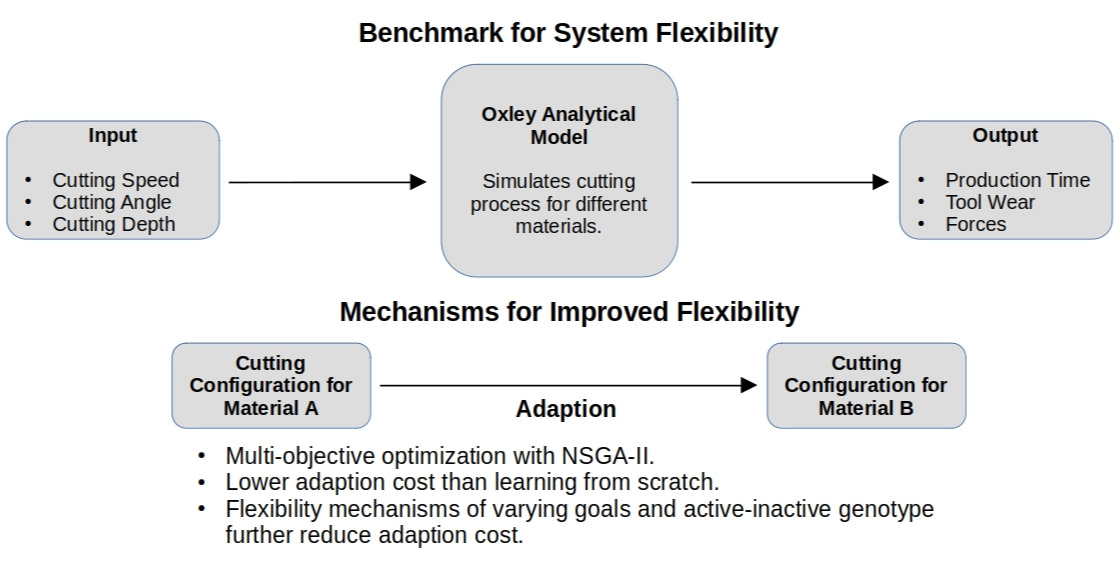 We further consider the system to be equipped with an evolutionary algorithm A that the system uses to optimize process parameters. Since evolutionary algorithm A and how it operates on system configuration space X are the main concerns in this paper, we formally denote the system by a tuple . In our example, the task T that the system has to perform, for a specific type of metal, is to optimally cut the workpiece according to some feasibility criteria and multiple objectives. For our purposes, we can consider this to be equivalent to A solving the associated multi-objective optimization problem. The cost in terms of objective function evaluations to solve this problem from scratch is denoted by .