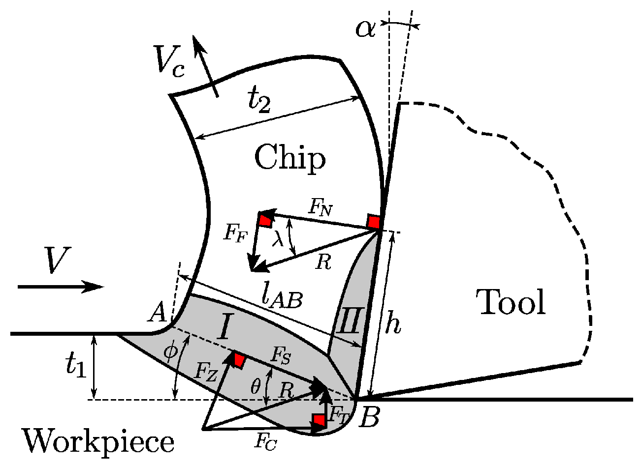 Figure 1 describes the analytical orthogonal cutting model. The material in the vicinity of the tool tip is divided into a primary shear zone (I) of length