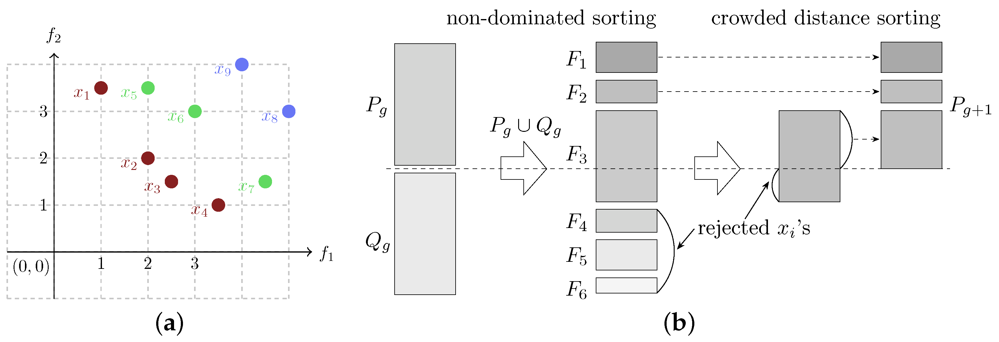 Figure 2a illustrates the concepts of Pareto front and non-domination classes.