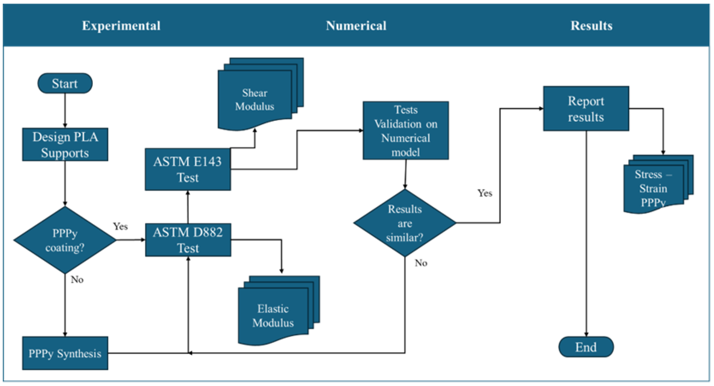 The methodology is focused on three stages. In general terms, the first stage describes the experimental test used to establish the mechanical properties, including elastic and shear moduli, of poly pyrrole (PPPy) produced by the plasma oxidation method. Unfortunately, mass production is insufficient for designing a sample. For this reason, and as a priority, we need to use support elements. They were impressed with 3D machines, considering acid poly lactic (PLA) as the support element, with 100% fill and planar reduction of noise on the surface. The second stage focused its activities on evaluating the mechanical properties of PPPy through numerical tensile validation using 3D model simulations, and the third stage involved analyzing the results. It is essential to mention that for the first stage, 3D PLA samples are manufactured and designed according to ASTM standards for each test, as well as for the mathematical estimation of elastic modulus. Each stage is described in general terms, as illustrated in the following diagram (