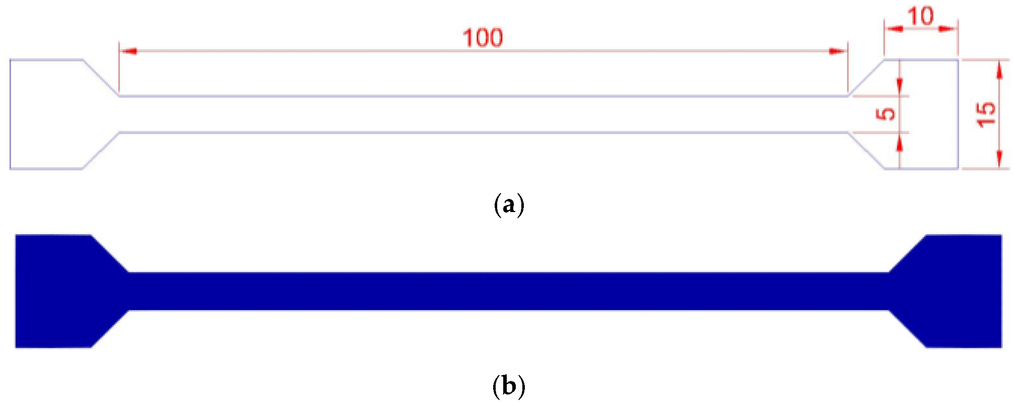 22], have a length of a maximum of 250 mm and a minimum of 50 mm, a width of at least 5 mm and a maximum of 25.4 mm, and a thickness of less than 1 mm. For research purposes, sample dimensions are 100 × 5 × 0.5 mm (L × W × T), which is suitable for low PPy production, considering a 15 × 15 mm grip section.