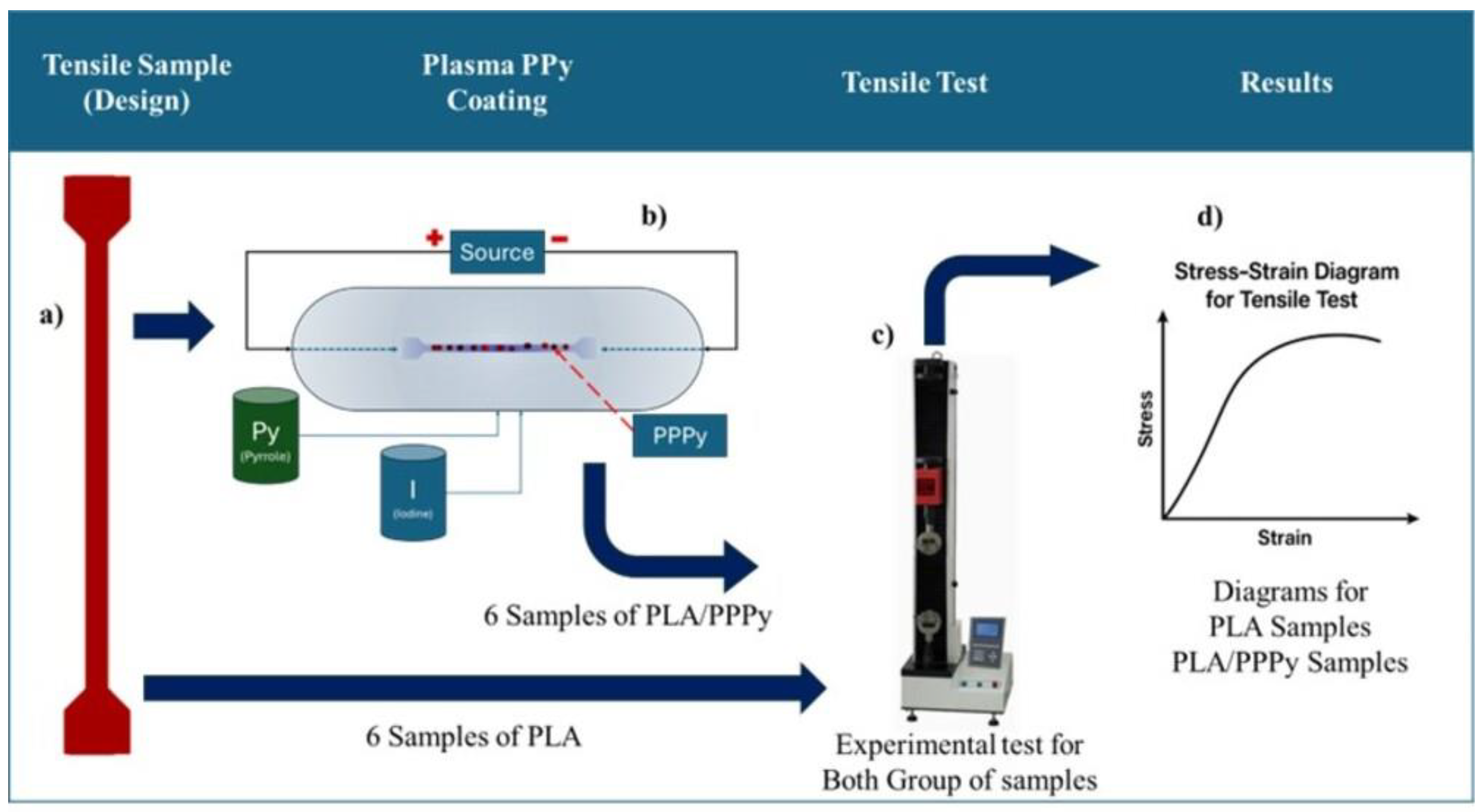 Figure 3 illustrates the processes for the tensile tests on PLA and PLA/PPPy samples.