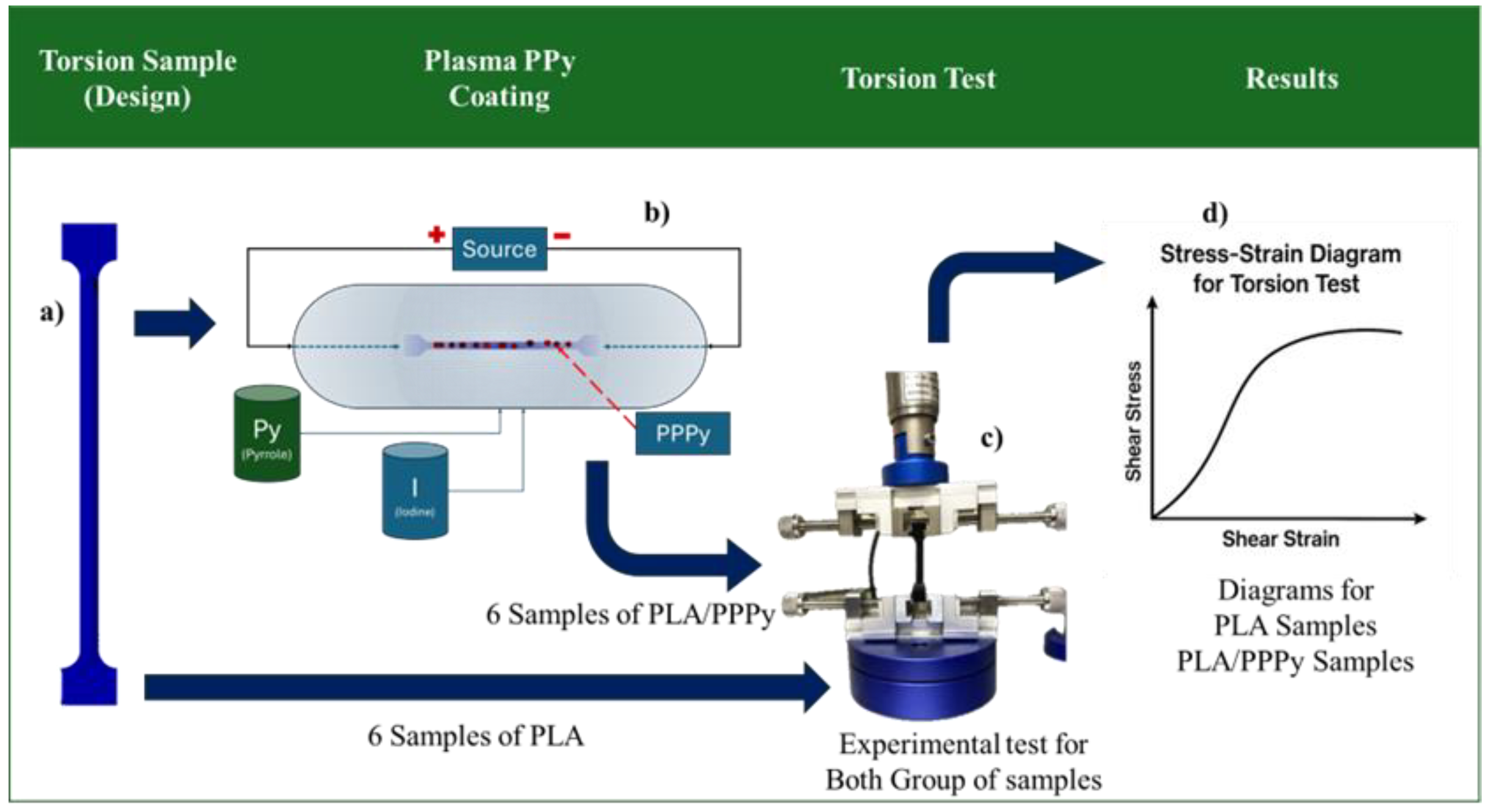 As mentioned before, there is limited information on how to estimate specific mechanical properties of poly pyrrole processed by plasma oxidation. Some results describe the behavior of PPy according to mass concentration. Additionally, synthesis methods directly affect their properties. Another problem originates from poly pyrrole production; it is not possible to synthesize more than 3 cm of total length to conduct at least a pure tensile test for PPPy. Furthermore, nanoindentation results on a macro scale are not reliable for simulation purposes. These challenges hinder the fundamental understanding of injury mechanisms, which need to be evaluated through numerical simulations. For this reason, this paper presents a composite methodology to characterize the elastic modulus for PPPy according to ASTM test standards D882 and E143, featuring a special design for a 3D composite sample that involves PLA as a support element, coating of PPy, and a geometrical grip section for each torsion and tensile machine test, where PPy was processed by plasma oxidation. The primary outcome is to define Young’s and shear moduli for PPPy, identify graphical differences between stress–strain diagrams with and without PPPy, and evaluate their mechanical properties as a scaffold in spinal cord simulations.