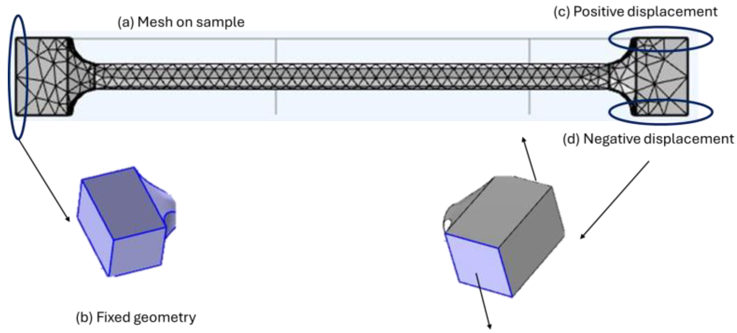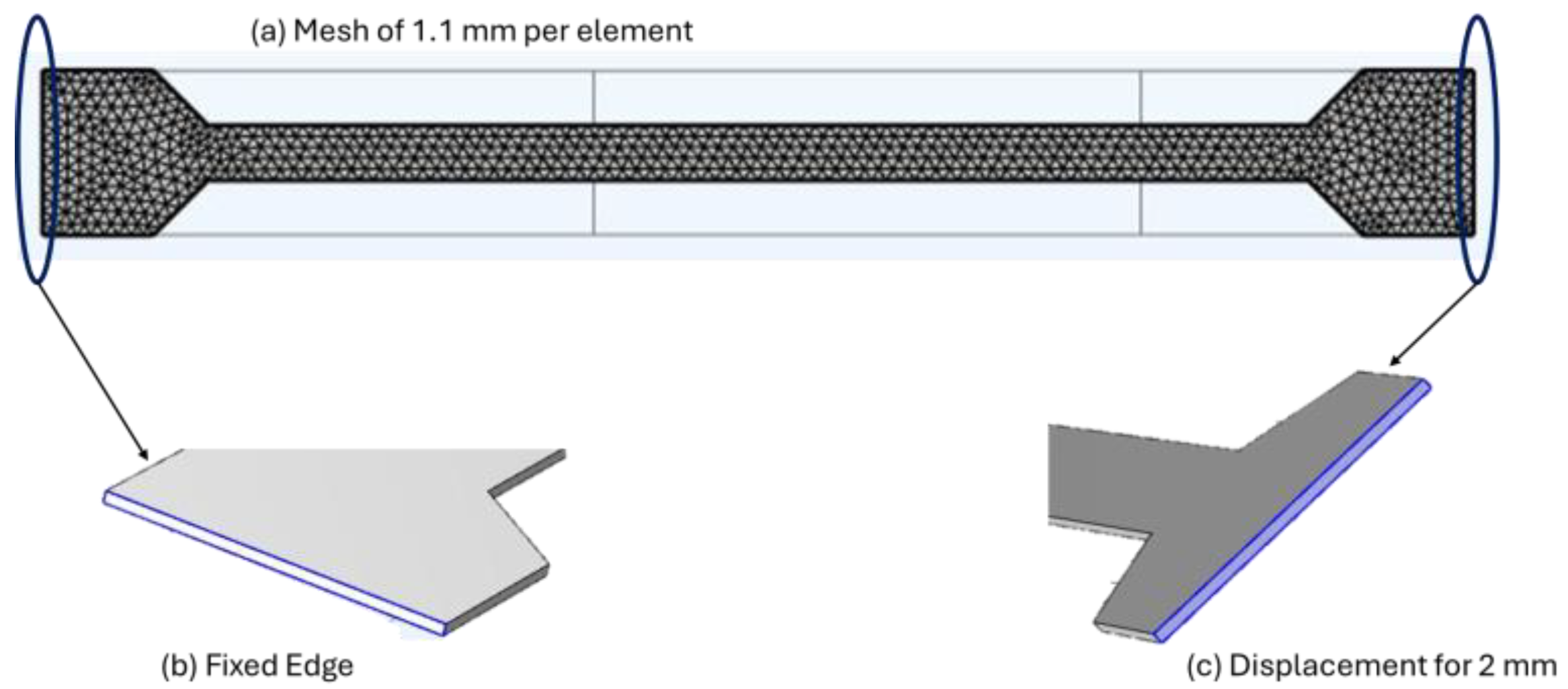 Boundary conditions are defined as follows: the grip sections are characterized by fixed and mobile geometries. The left edge of the grip section is described as having fixed geometry on lateral edges, while the right edge is defined as having mobile geometry, considering a 2 mm displacement in the X direction.