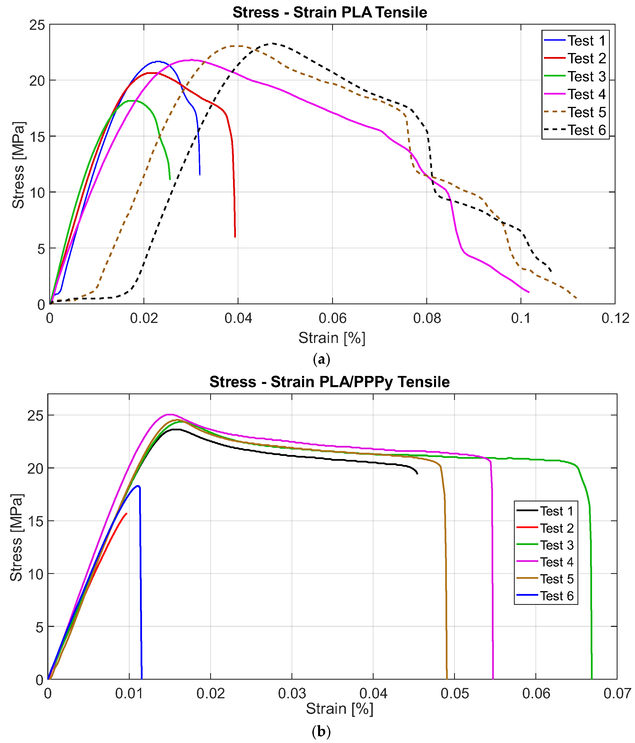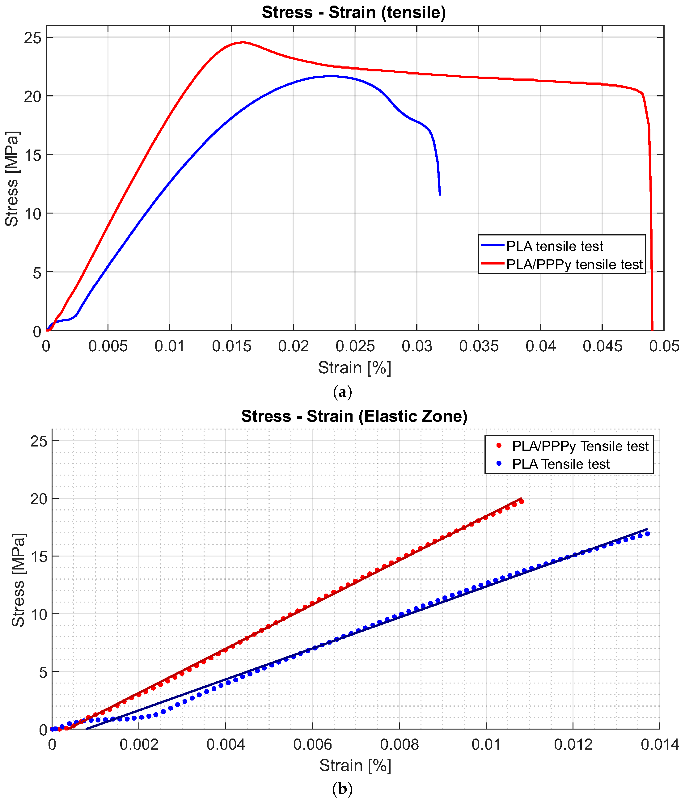 Figure 10 describes an example of the difference between the diagram Stress–Strain for PLA and PLA/PPPy coating samples and their linear zone to estimate their elastic moduli. Additionally,