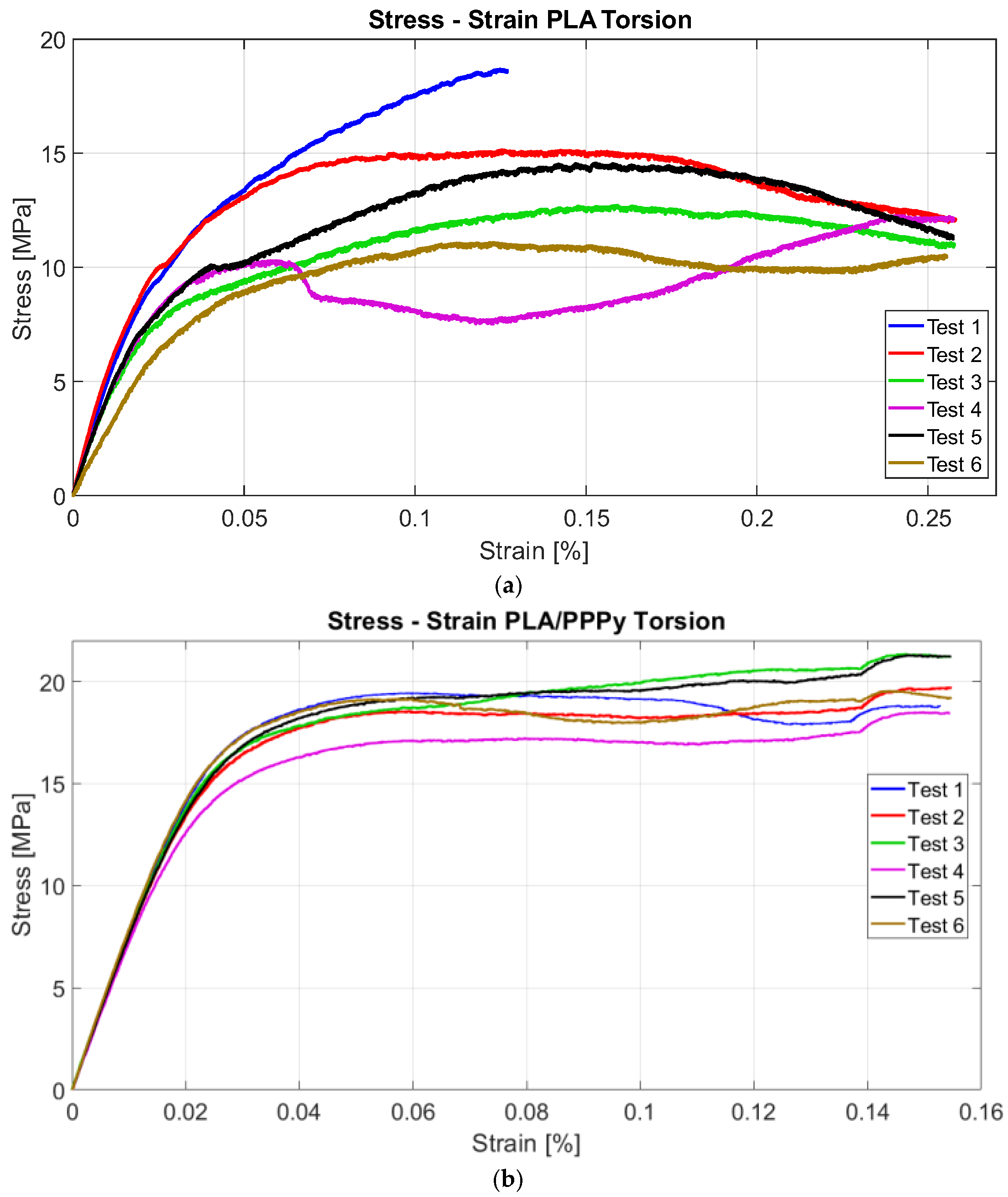 Similarly, all results obtained by the ASTM E143 method follow the same characteristic to estimate the shear modulus. The first group of PLA tests exhibited similar behavior across all tests. Five samples had a similar response to the test, and the machine recorded at least 20,000 data points for each test, including angle and torque values. It was necessary to estimate shear stress and Strain with mathematical expressions 1 and 2. Similar to the tensile test, the value of behavior on the torsion test increases when a layer of PPPy coat is applied to a PLA sample;