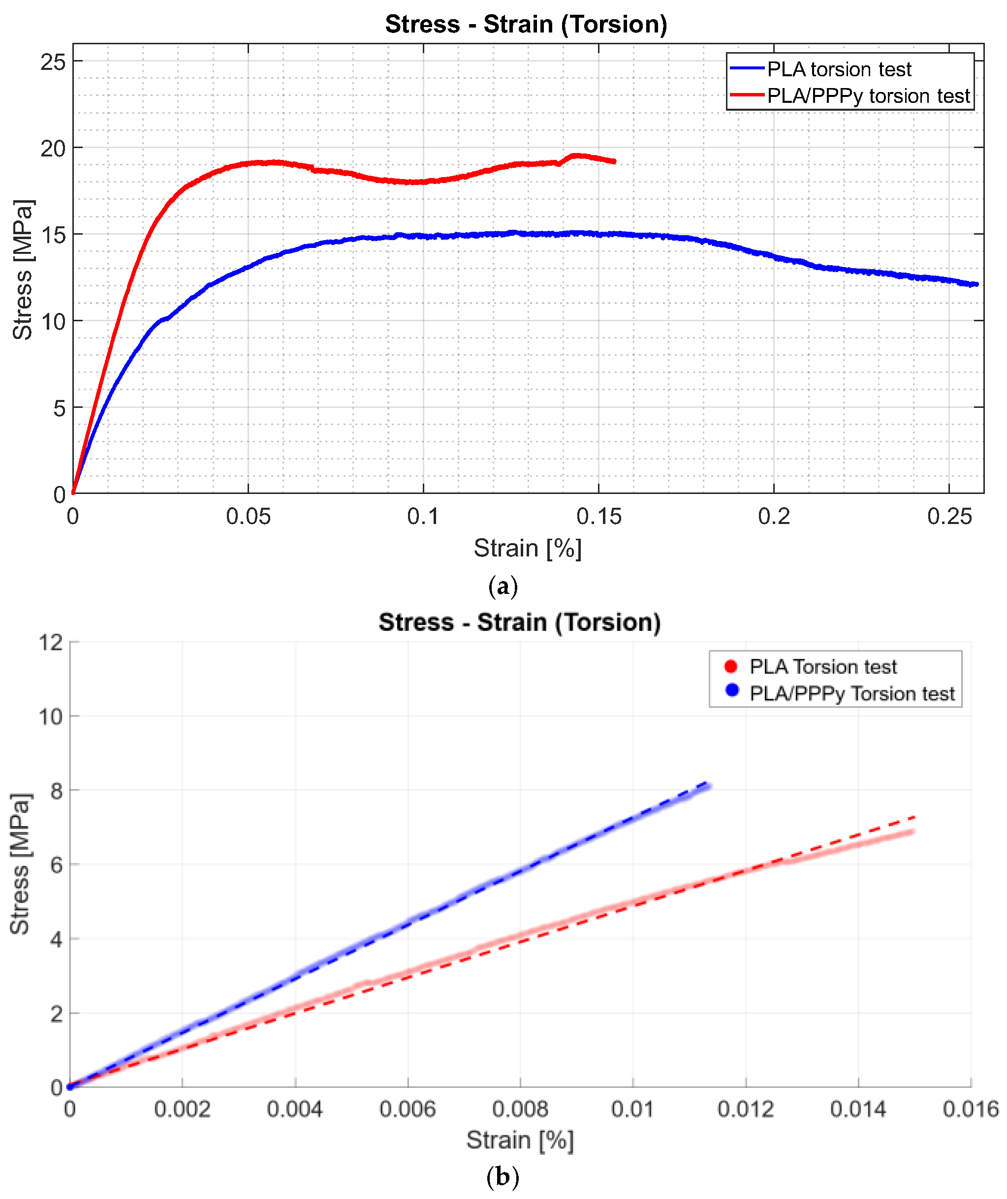 The stress–strain diagrams shown previously exhibit a significant discrepancy between PLA tests and PPPy coating; in other words, this behavior is variable between them, rather than representing repeatability, which describes considerable control between tests. Just like tensile tests, some properties can be obtained from the diagram projection. The shear limit can be taken as a point for the elastic zone and used to estimate the value of the shear modulus as a linear function. The layer of PPPy on the PLA sample increases the value for mechanical behavior on the torsion test, and the linear function describes this increment in shear modulus.