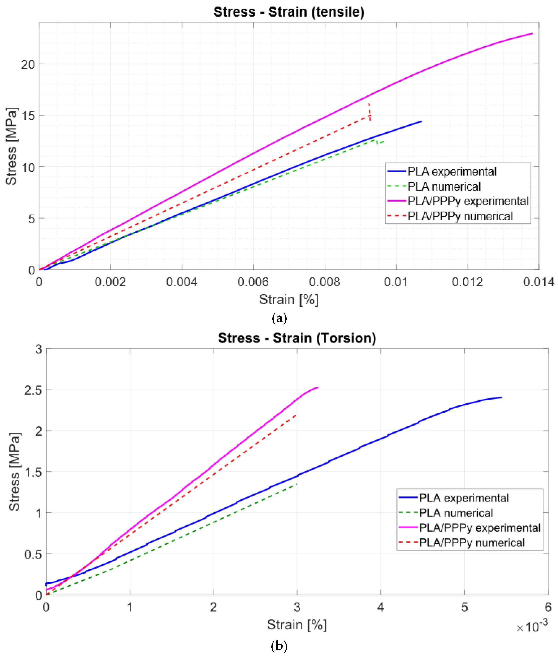 Alternatives to polymeric materials, such as poly pyrrole, whose physical, chemical, and biological characteristics do not compromise or impair its interaction with tissues, represent a novel solution and field of research. Poly pyrrole was first used in neurological regeneration and has shown promising advances in recovering motor and sensory functions. The advantages of accessibility, synthesis for plasmatic oxidation, and compatibility make it an excellent option for implanting and use in tissues whose function is compromised by injury. It has shown that all variations in the elastic modulus of poly pyrrole are directly influenced by the synthesis methodology by which it is produced; in the chemical process, the elastic modulus is in the range for 2 or 3 GPa when it is used as a composite on mixed with another material; in the case of the electrochemical process, it is near the 20 or 50 kPa range; with this alternative for estimating mechanical properties for poly pyrrole produced by plasma oxidation, the result has a value near to 360 MPa only for the polymer. The custom design of tensile samples for use in the characteristic tests considered the area of the grips and their attachment, ensuring a proper fit and alignment without compromising the test area. Additionally, the post-processing for each sample could make a difference in test behavior. In PLA samples, all characters were guaranteed; however, when tensile or torsional tests were performed, the relationship between stress and Strain behavior varied depending on the test performed on the same sample. This effect can be attributed to the slight increase in temperature during the polymerization process, which likely led to fusion or significant adhesion in the PLA and PPPy samples, thereby enhancing their mechanical behavior in the test. As future work, it is considered important to evaluate the polymeric adhesion level on the surface. Not only can the polymer stabilize the stress and Strain, but it is also necessary to carry out more tests on PLA to ensure greater repeatability. Analysis of the elastic zone in the stress–strain diagrams of pure PLA and poly pyrrole-coated samples reveals a clear visual difference between the test slopes. The value of the tensile modulus estimated graphically using linear regression considers the adjusted behavior of the material’s elasticity by integrating the data series into a linear model whose slope accounts for all the points surrounding it. For the elastic section, it is possible to approximate the value of the elastic modulus. For PPPy, the value is 360.11 MPa. This result was evaluated using the computational tool COMSOL Multiphysics to validate each test. The similitude for each modulus is based on the origin of plastic deformation in the torsion sample caused by the constant current during polymerization; therefore, the value for the shear modulus is similar in both numerical and experimental tests.