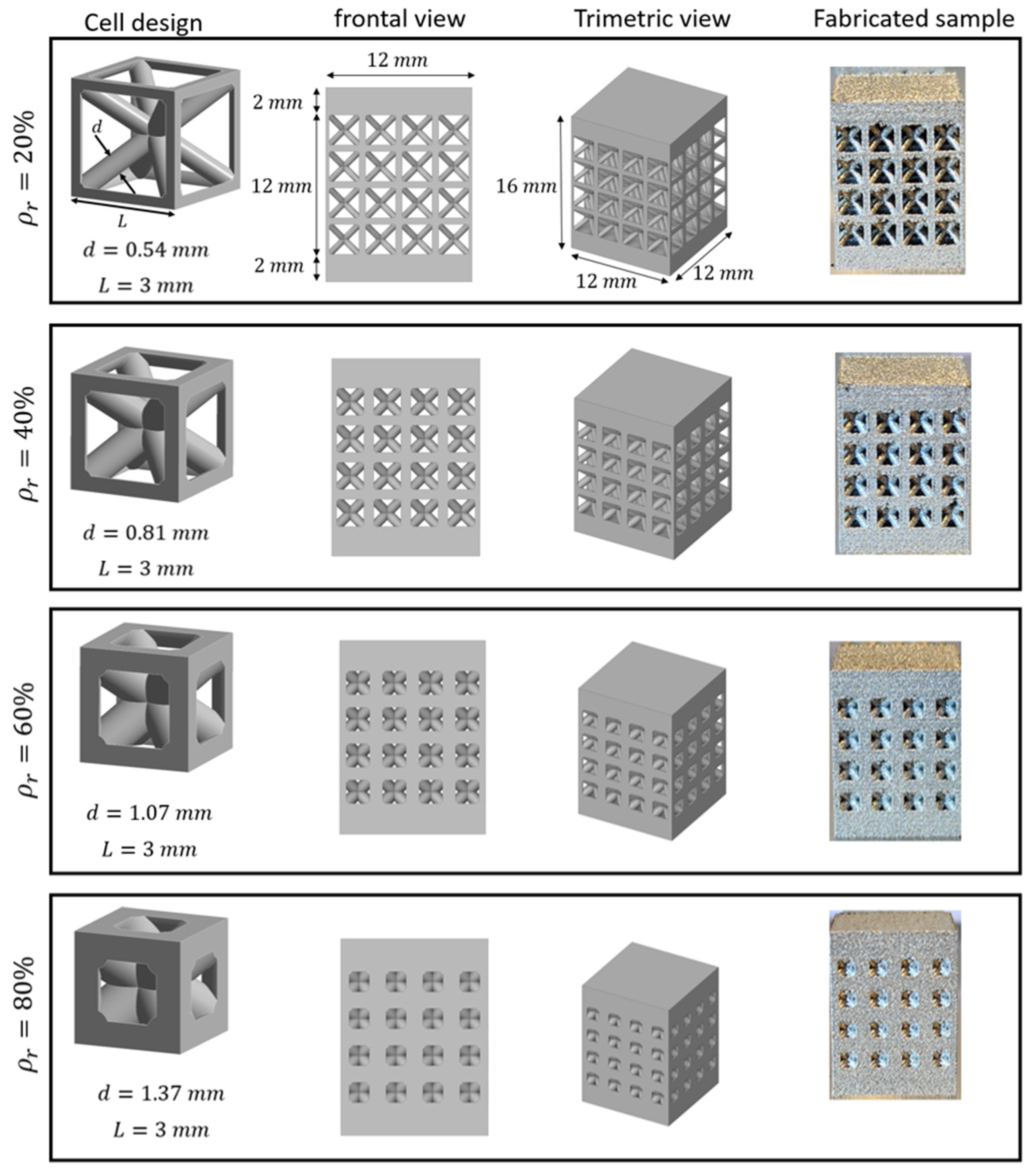 - Olivas-Alanis, L.H.; Fraga-Martínez, A.A.; García-López, E.; Lopez-Botello, O.; Vazquez-Lepe, E.; Cuan-Urquizo, E.; Rodriguez, C.A. Mechanical Properties of AISI 316L Lattice Structures via Laser Powder Bed Fusion as a Function of Unit Cell Features. Materials 2023, 16, 1025. [Google Scholar] [CrossRef]