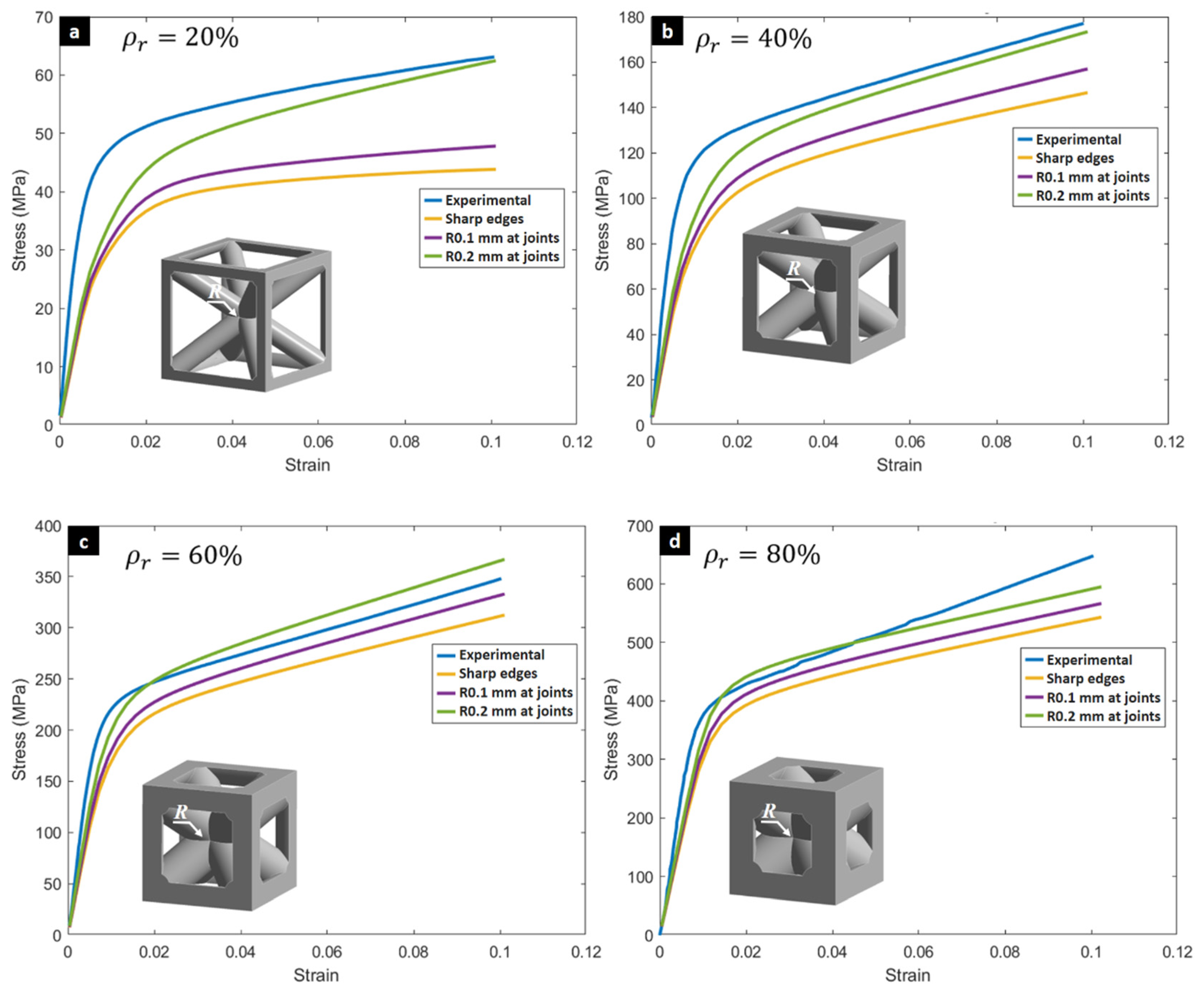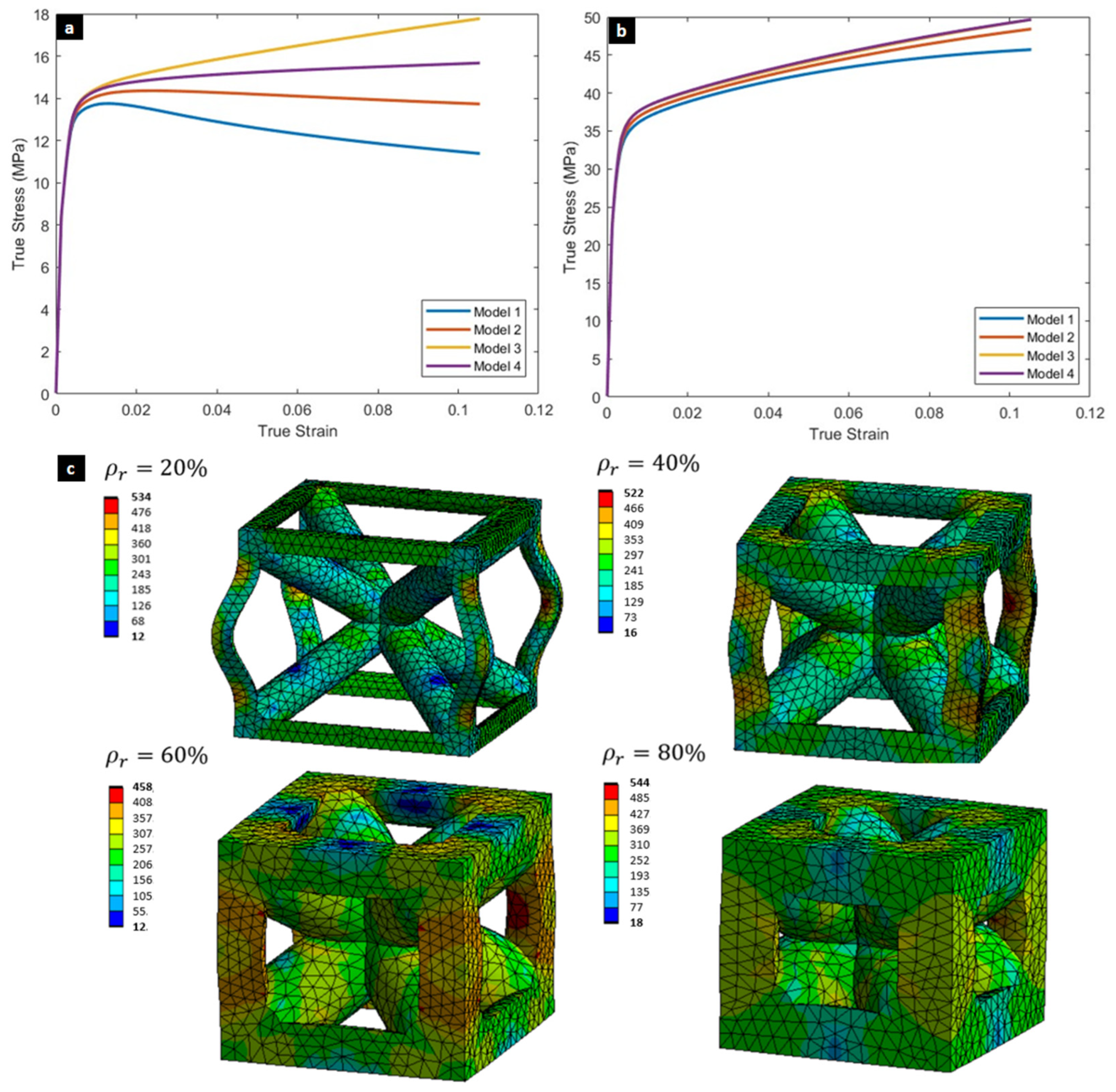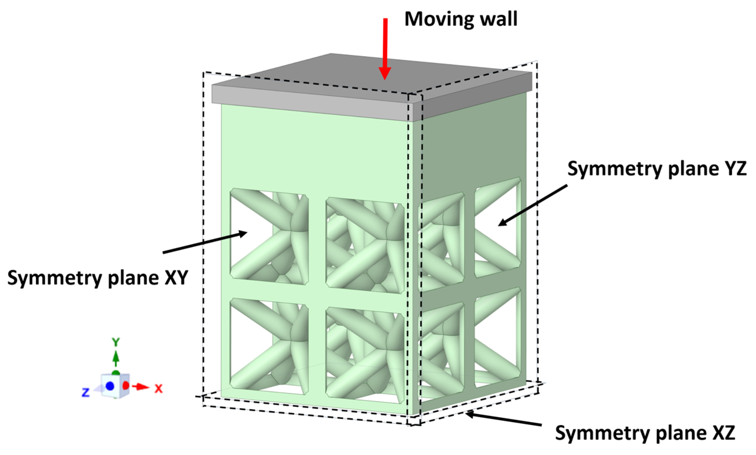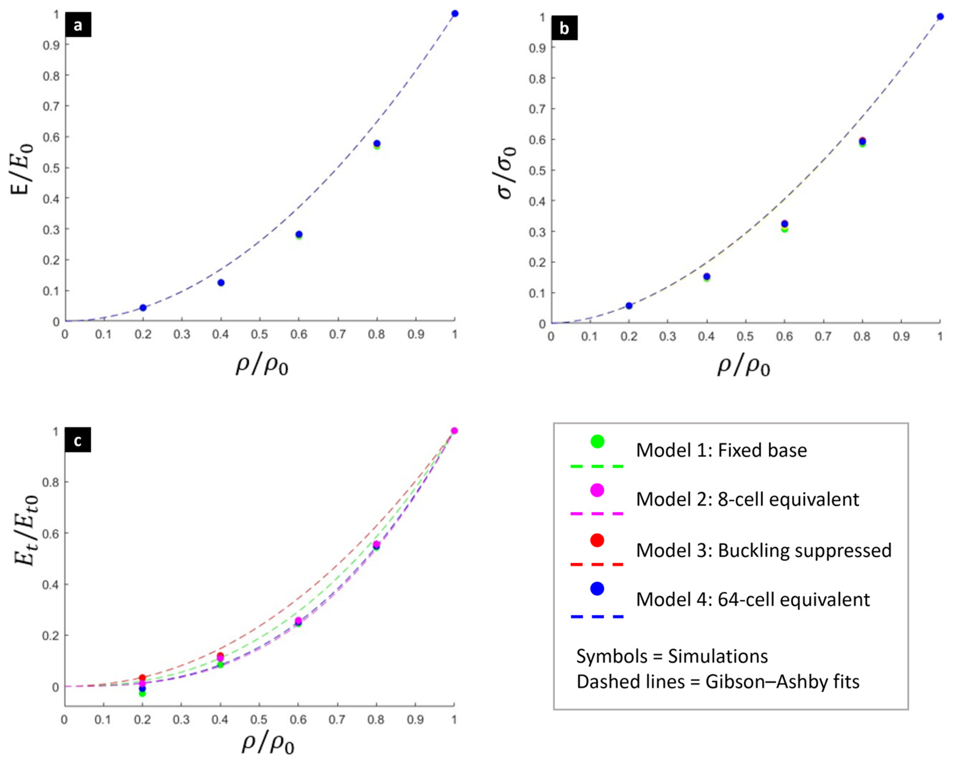 - Model 4: 2 × 2 × 2 multi-cell model with symmetry planes (equivalent to 64 cells). All models were compressed to 10% strain under displacement control.