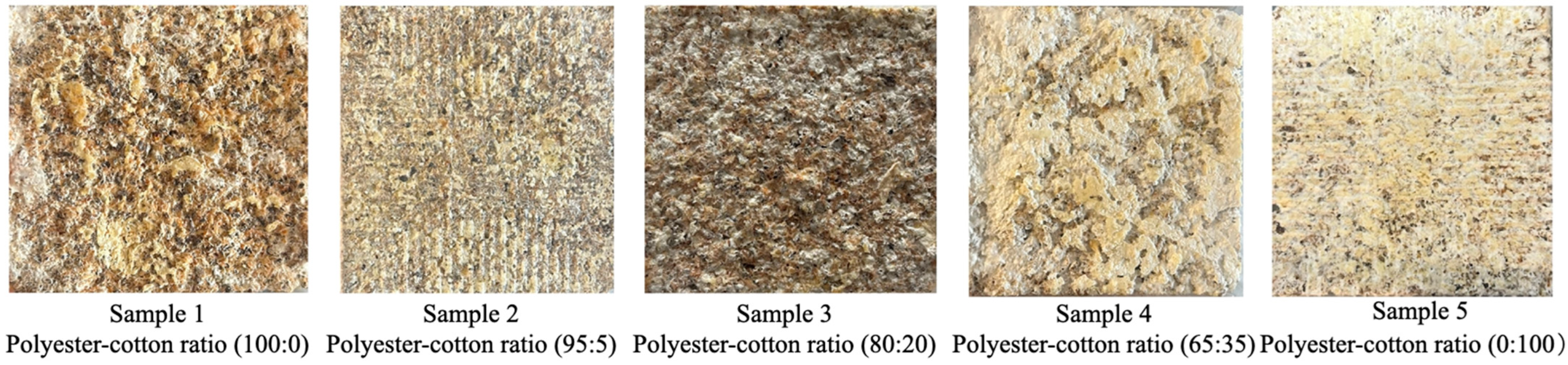 - Matsumura, M.; Inagaki, J.; Yamada, R.; Tashiro, N.; Ito, K.; Sasaki, M. Material Separation from Polyester/Cotton Blended Fabrics Using Hydrothermal Treatment. ACS Omega 2024, 9, 13125–13133. [Google Scholar] [CrossRef] [PubMed]