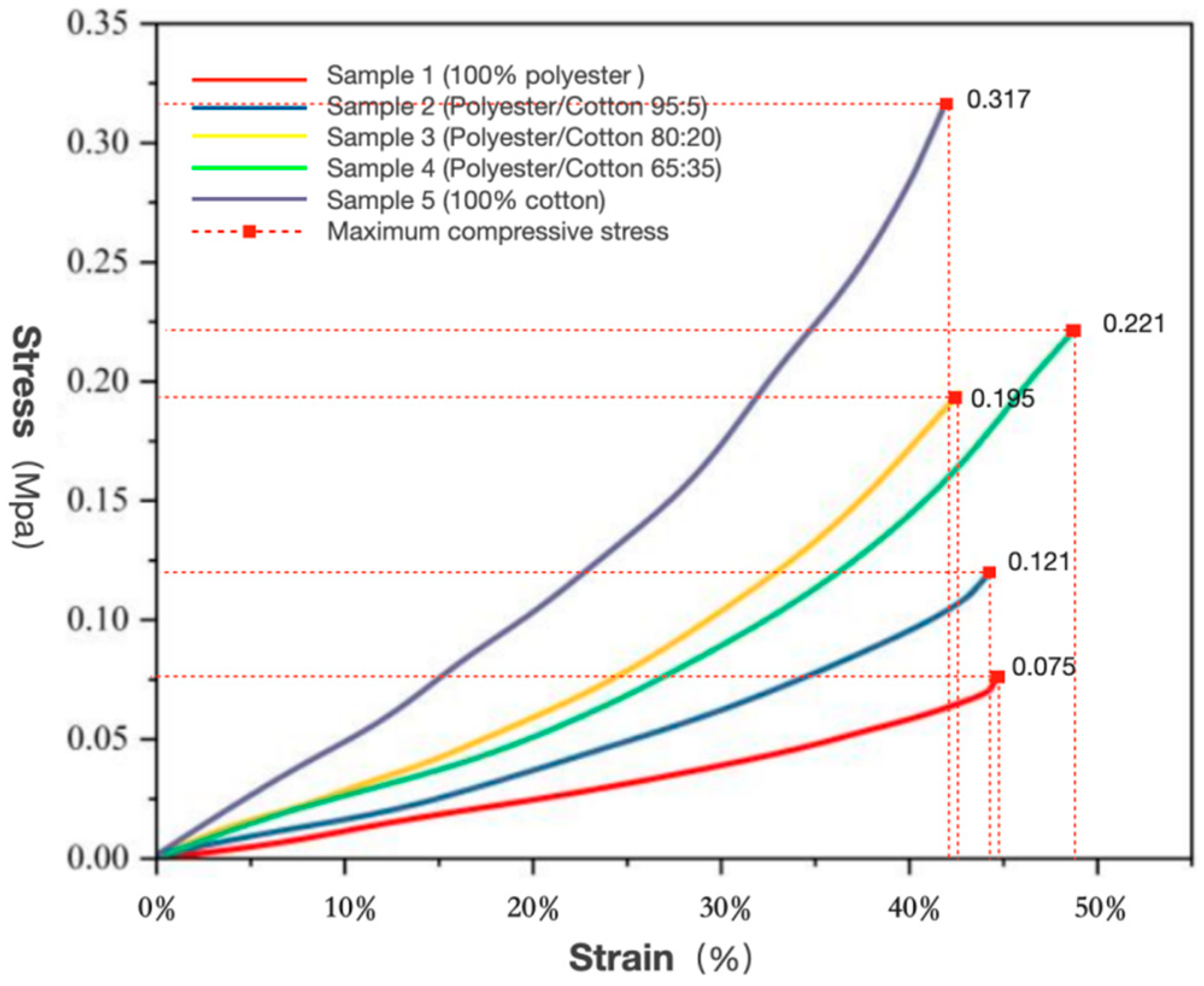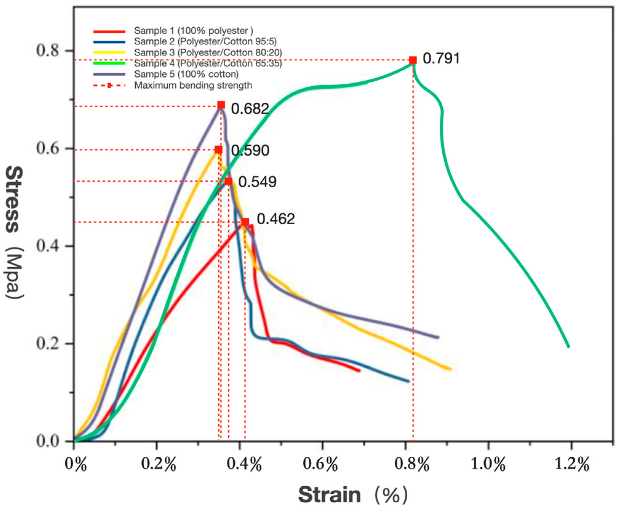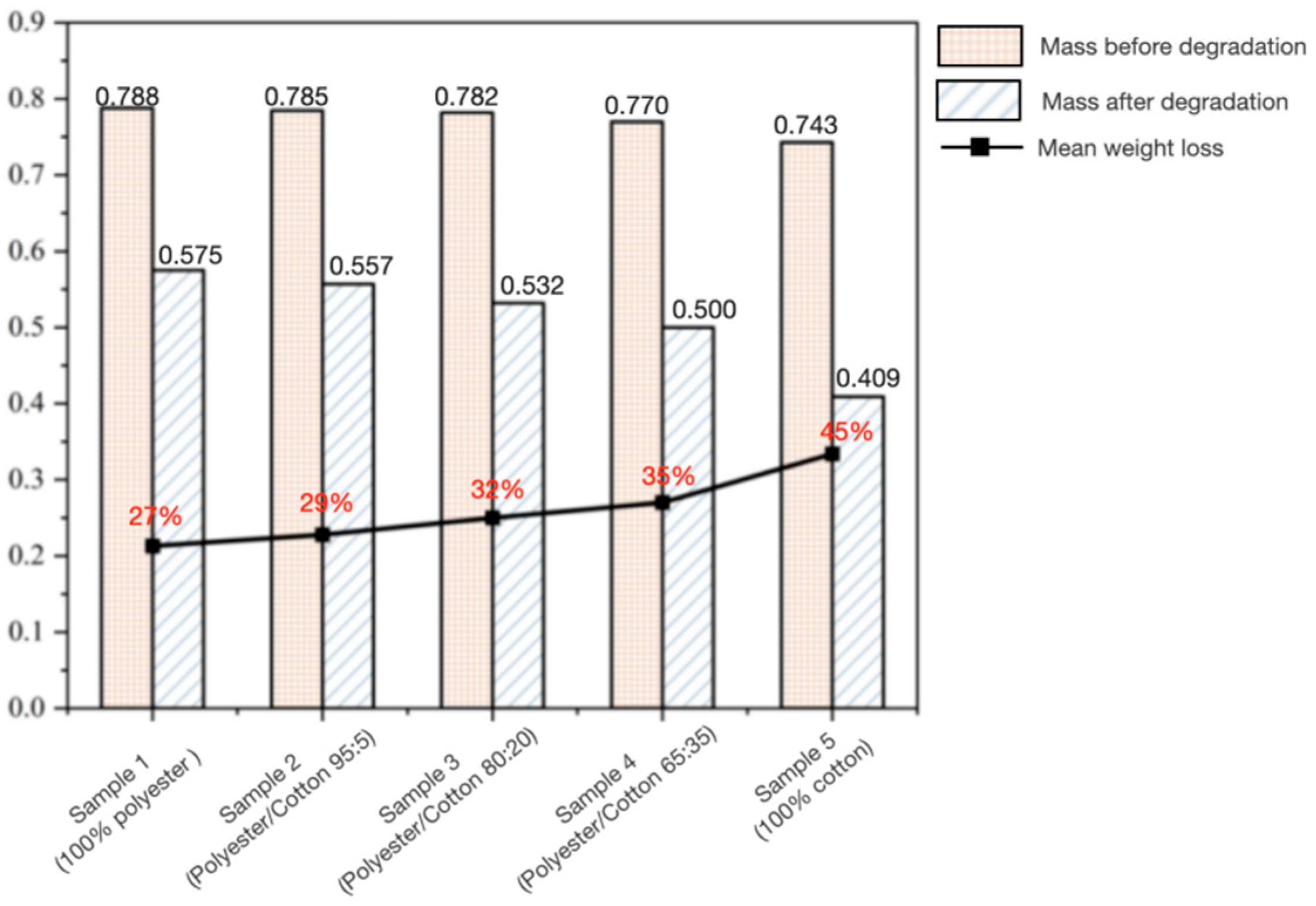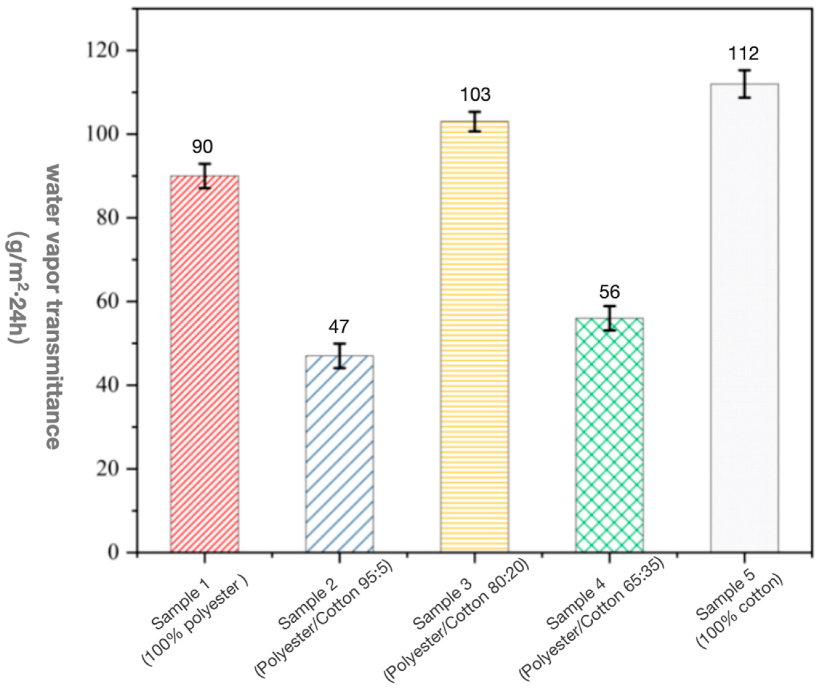 Repeat Repeat Sample | Sample 1 Polyester–Cotton Ratio (100:0) | Sample 2 Polyester–Cotton Ratio (95:5) | Sample 3 Polyester–Cotton Ratio (80:20) | Sample 4 Polyester–Cotton Ratio (65:35) | Sample 5 Polyester–Cotton Ratio (0:100) |