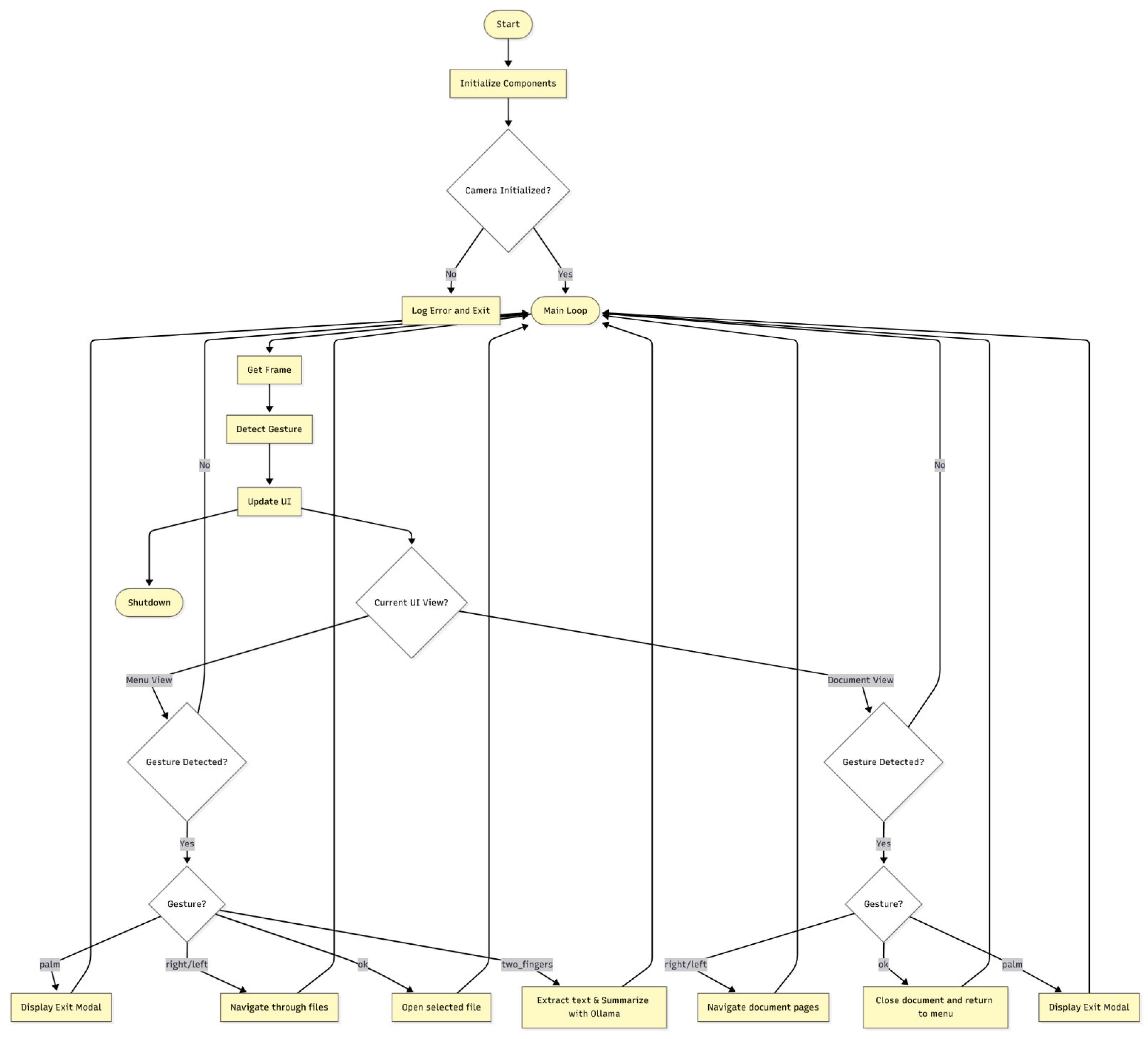 From a software architecture perspective, the system follows an event-driven model where the primary input events are hand gestures, and their interpretation triggers context-aware actions depending on the current UI state (menu or document). The main application loop handles these events synchronously, while time-intensive operations such as AI generation are dispatched to separate threads using Python’s built-in threading module to prevent UI blocking and ensure responsiveness.