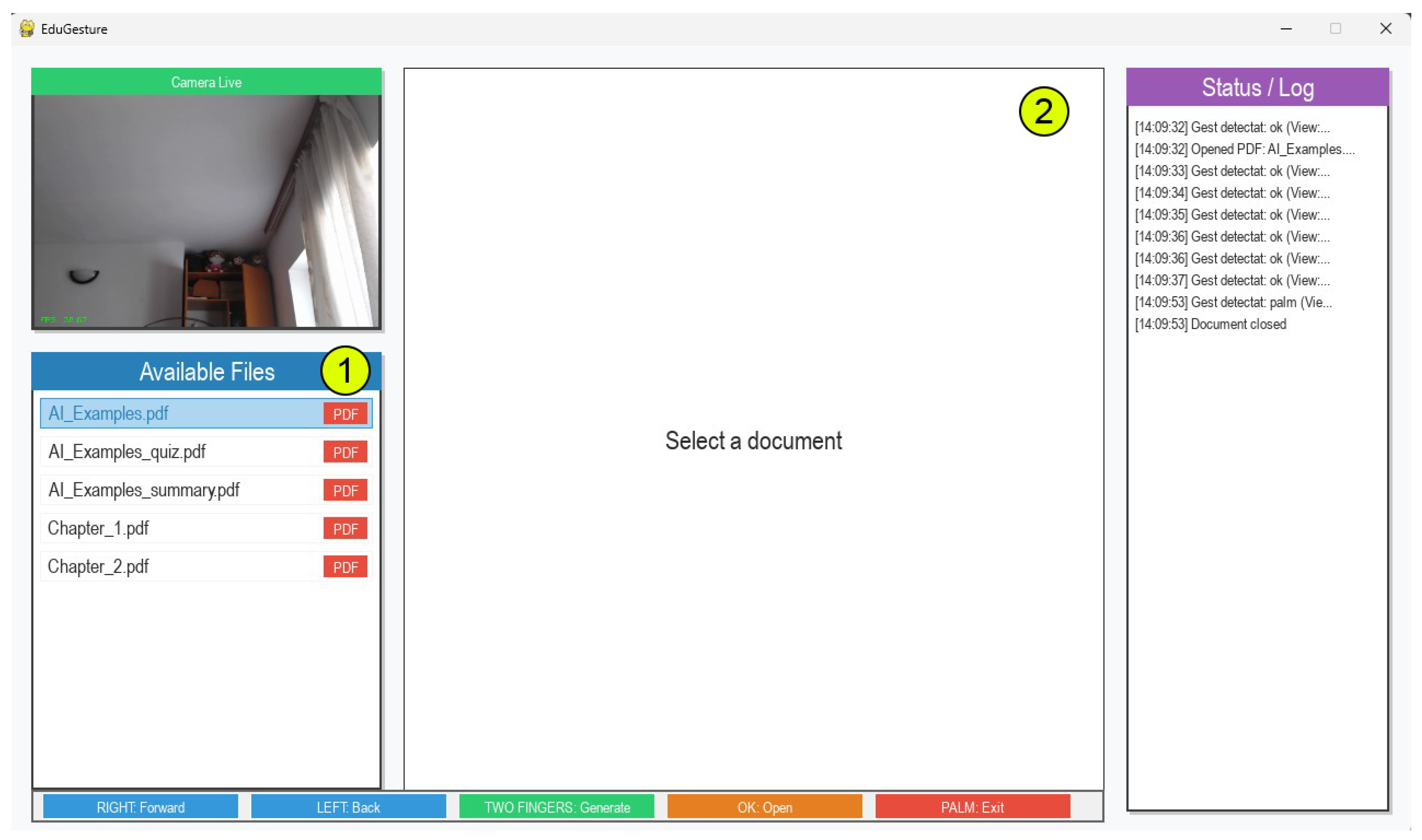 The average system response time from gesture detection to interface action was measured at ~872 ms, including gesture recognition, command dispatching, and UI update. The generation of AI content (summary + quiz) via Ollama averaged 12.86 s, depending on document length and system load. These values were acceptable for real-time interaction in a learning context and did not interrupt user flow.