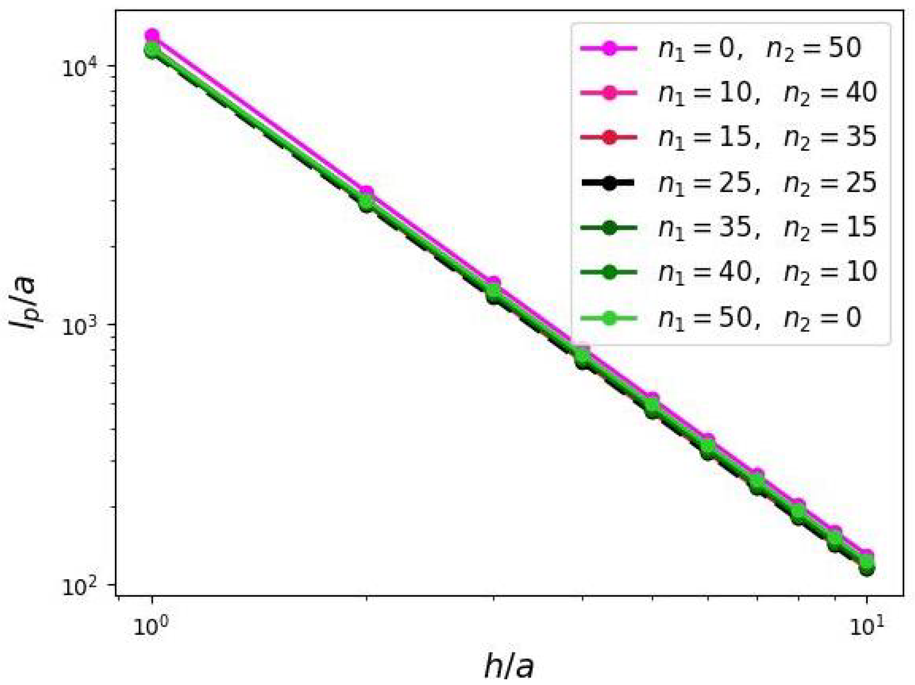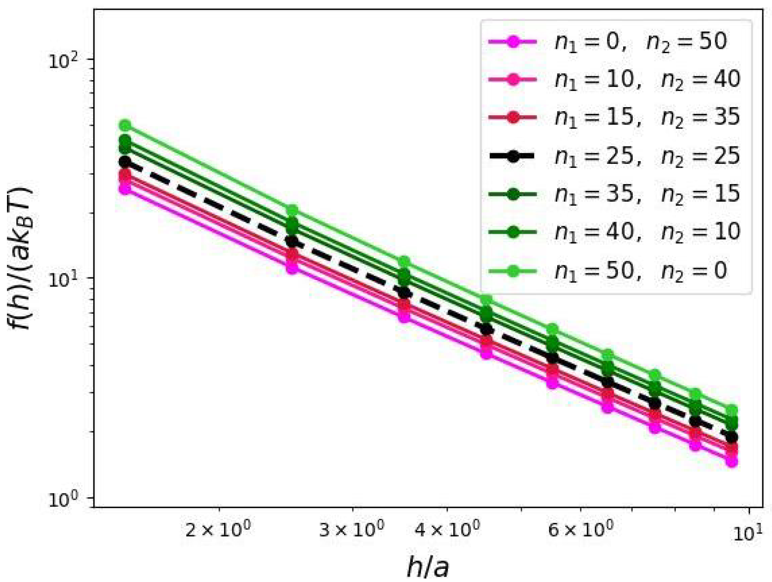 The monomer units comprising the grafted comb-like chains were assumed to be identical in size to each other and to the solvent molecules. The length unit was taken as the linear size of a monomeric unit, a, and the energy unit was taken as , where is the Boltzmann constant, and T is the absolute temperature. The grafting density of the primary side chains to the backbone was defined as , where h is the distance between the adjacent grafting points of the side chains.