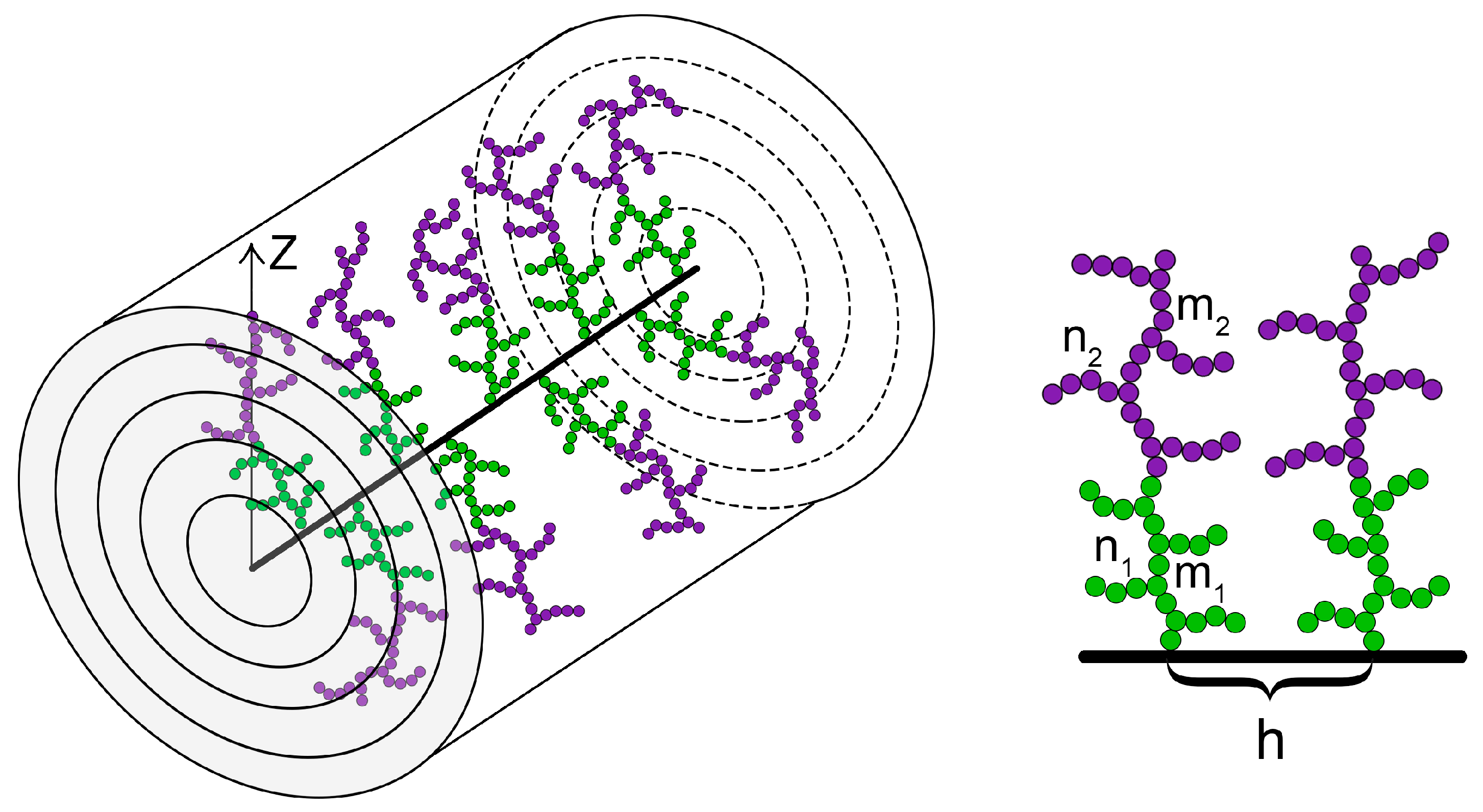 We focused our study on brushes composed of double-comb-like (DC) macromolecules, Figure 11. Each DC macromolecule is attached by one end of its main chain to the primary main chain (backbone) of the bottle-brush.