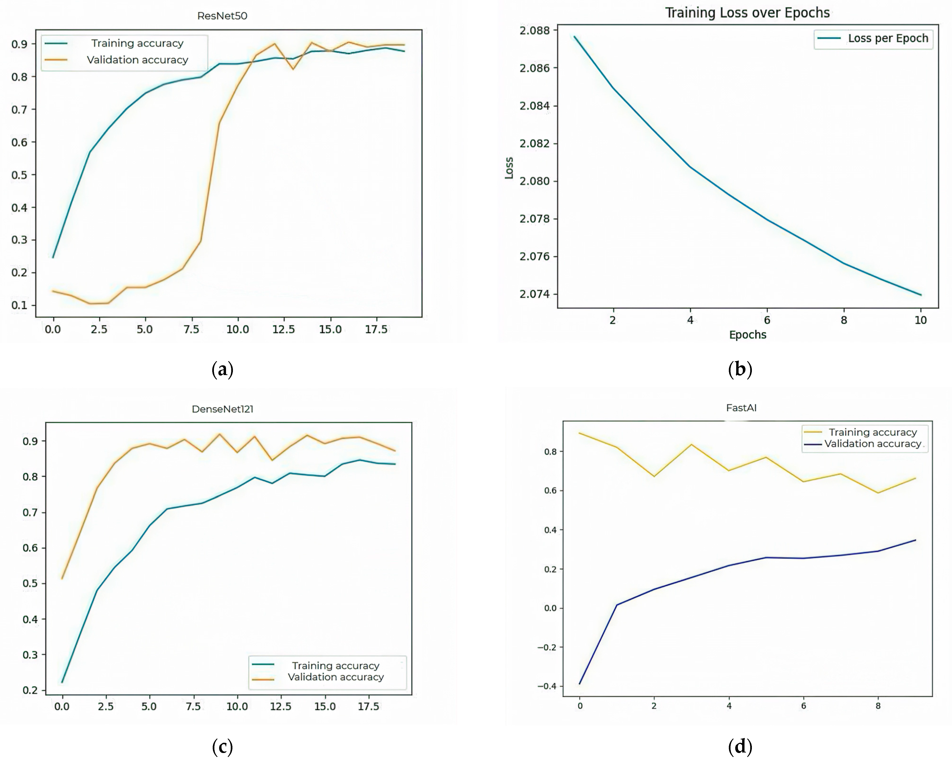 Figure 2b shows the categorical cross-entropy loss values computed on the training set across successive epochs for the ResNet50 model. The downward trend reflects effective learning and progressive error minimization during model training.