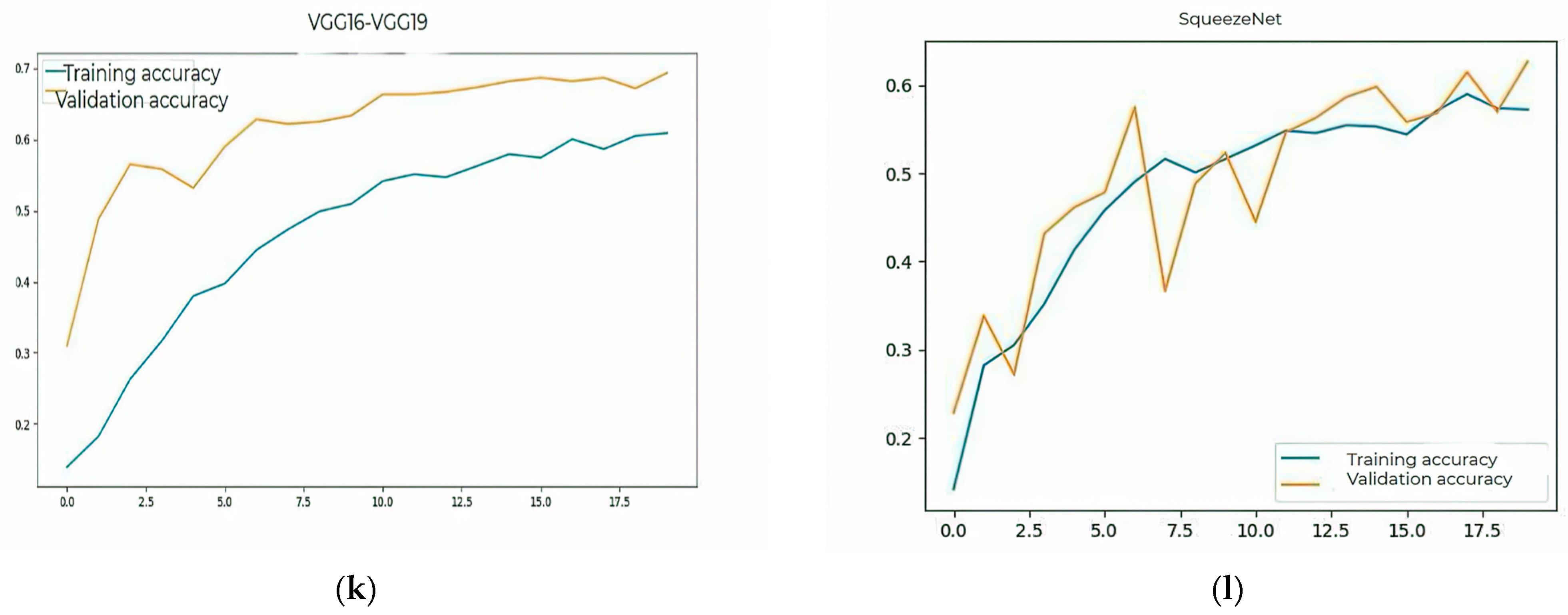 Figure 2k. SqueezeNet had an accuracy of 57% on training and 63% on validation. Although extremely compact and fast, the model failed to capture essential features of medical images sufficiently well.