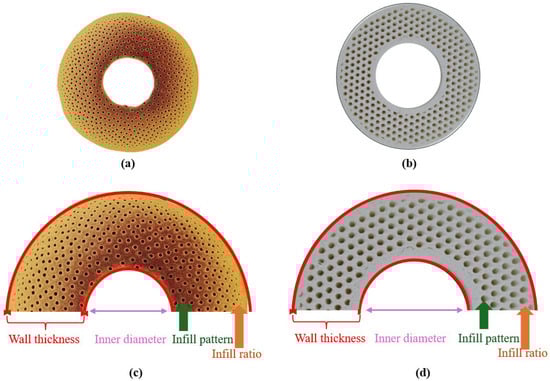 All samples are produced using fused deposition modelling (FDM) technology with the Bambu Lab X1E, a 3D printer designed for high-precision and multi-material production. The geometric properties of the circular structures’ wall thickness and inner diameter are modelled using a CAD-based drawing program. The infill patterns and infill ratios to be used during production are defined through Bambu Studio 2.2.2.56, Bambu Lab’s own production software. This software allows for the precise adjustment of the infill structures and controlled implementation of the printing protocol. A standard nozzle tip with a diameter of 0.4 mm is used in the production processes, and all samples are printed with the same production parameters, ensuring the reliability of inter-parameter comparisons. The basic parameters used in the 3D manufacturing process are given in Table 3. All specimens used in the experimental study are manufactured with a polylactic acid (PLA)-based filament material supplied by BASF.