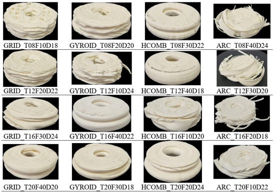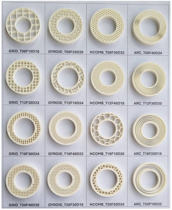 Additionally, 5 mm high samples are produced to visually identify each configuration and are presented in Figure 2. These samples facilitate both monitoring print quality and matching parameters with model labels. For example, a sample labelled GYROID_T08F20D20 indicates a gyroid infill structure, 0.80 mm wall thickness, 20% infill, and 20 mm internal diameter.