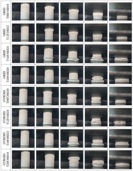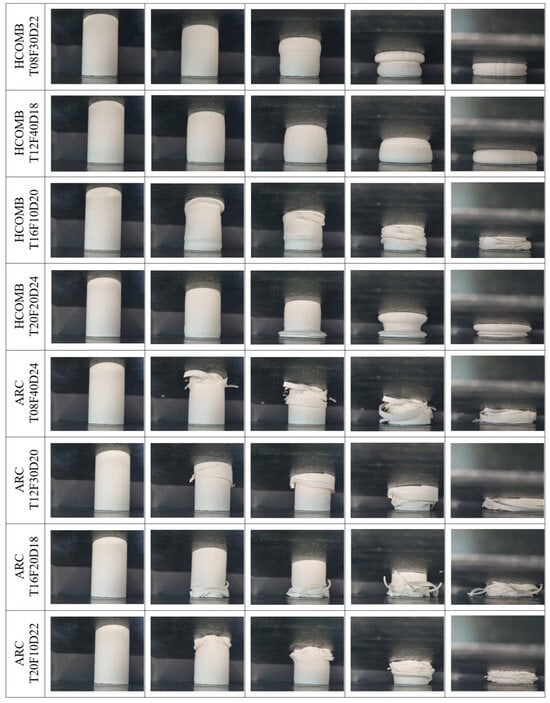 In this section, the results obtained in the compression experiments performed under quasi-static conditions with a constant speed of 5 mm/min of the parts created with the Taguchi L16 orthogonal array and produced in a 3D printer will be examined in detail. In this section, first, the deformation modes and force–displacement curves will be explained, and then the effects of the parameters will be analysed with Taguchi. The deformation modes of the bamboo-inspired circular structures during compression tests are given in Figure 3 and Figure 4. The deformed form of all models at the end of the compression tests is also given in Figure 5. The impact force–crushing displacement curves of the bamboo-inspired circular tubes are also given in Figure 6.